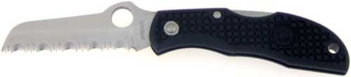 This knife is a perfect key-ring companion or for any small pocket. Black fiberglass reinforced nylon (FRN) handles. Quality VG-10 stainless steel serrated sheepsfoot blade. This Spyderco knife has the standard Spyderco round hole for easy opening. Ever popular lockback is rock solid and makes this little wonder safe to use. A dandy little knife. Comes brand new in box.