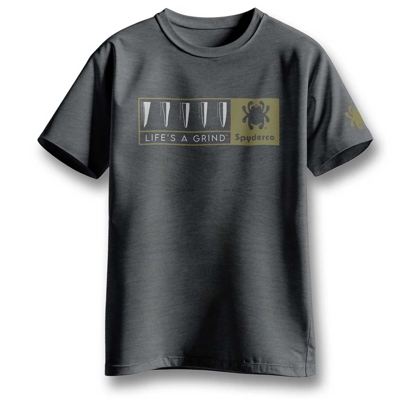 Show your enthusiasm for the Spyderco brand with an official logoed T-shirt. This Dark Heather Gray T-shirt features our “Life’s a Grind” graphic on the front and a Spyderco “bug” on the left sleeve. Made from 65% polyester/ 35% cotton fabric.