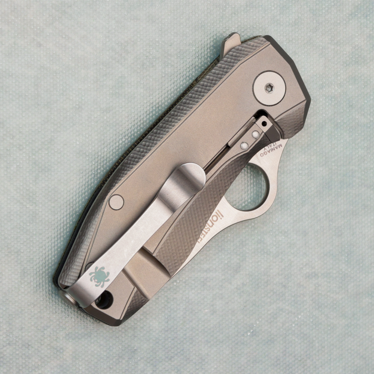 Inspired by the lionSTEEL Nano the SpyNano delivers high performance with exceptional style. Its satin finished drop point blade is crafted from Böhler-Uddeholm’s M398 powder metallurgy stainless steel, which has an exceptionally high carbide volume and is capable of achieving extremely high hardness and edge retention. The hollow ground blade rides on ball bearing pivot washers and includes both our signature Trademark Round Hole and a removable flipper opener for swift one handed opening. The knife’s unique handle showcases solid titanium on one side and linerless green canvas Micarta on the other. The titanium scale is precision machined to create the knife’s stout Reeve Integral Lock (R.I.L.) mechanism and includes a hardened steel interface/overtravel stop. A reversible deep pocket clip mounts to the butt end of the handle to provide a choice of left or right side tip up carry. This remarkable knife is being released as a Flash Batch—a distinctive, one of a kind expression of a model that has not been previously produced. Every knife will be individually serialized with discreetly placed laser engraving. Brand new in zippered pouch.