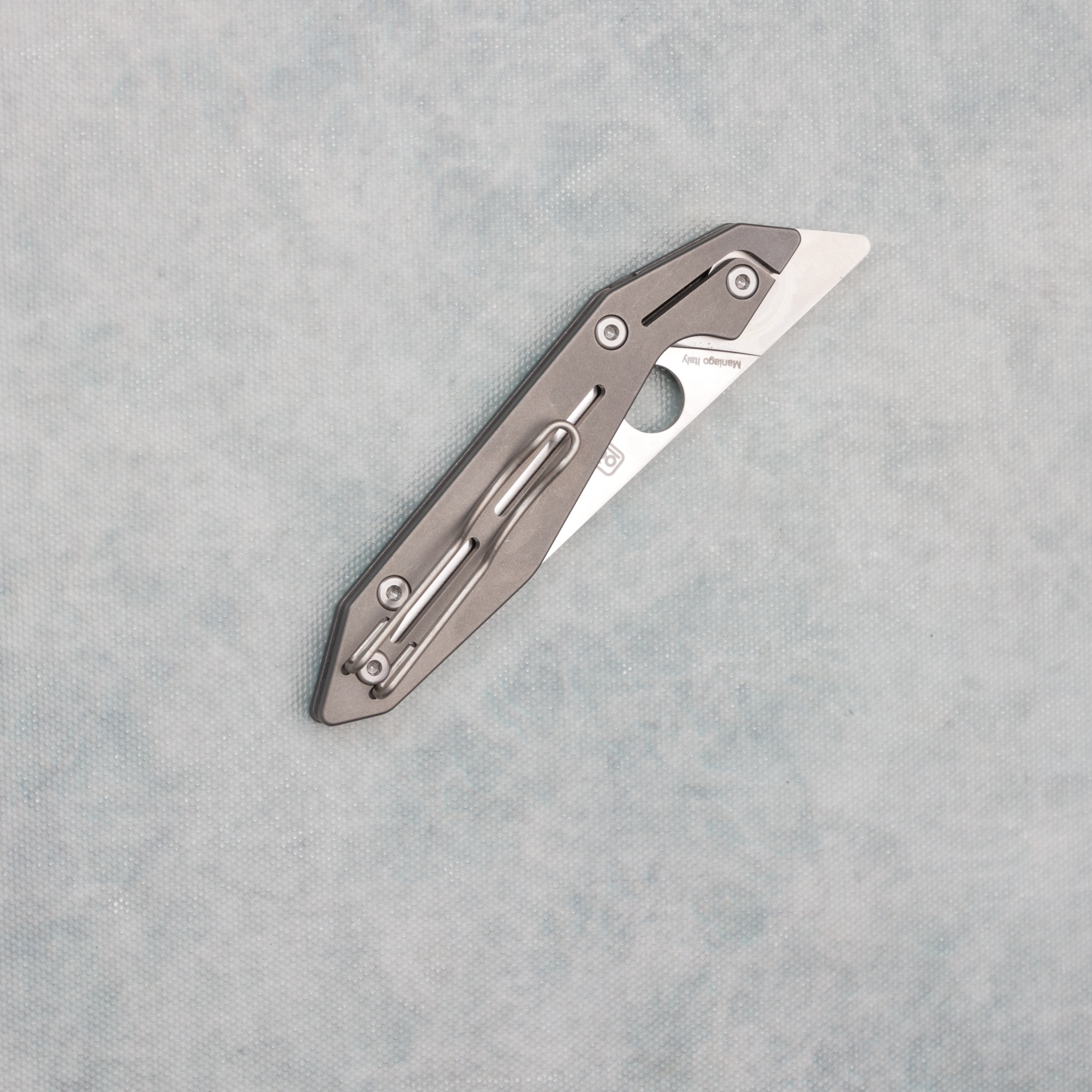 From the mind of Paul Alexander, a Ph.D. in Mechanical Engineering and lifelong knife enthusiast, the NAND is a unique new addition to our SLIPIT family of non-locking folding knives. In the closed position, the “tail” of its full flatground blade extends from the pivot pin end of the handle, allowing the knife to be opened one handed like a classic straight razor. Once open, twin ball bearing detents within the handle’s frame index the sides of the blade to hold it in place. Together, this Ball Joint Non-Locking Mechanism, hand pressure on the blade’s tail, and generous finger choils provide an extremely safe and secure grip. The NAND’s full flat ground blade is crafted from M398 stainless steel and also features a fully functional Trademark Round Hole. Its handle scales are precision machined from solid titanium and are home to a reversible deep pocket wire clip that completes the knife’s completely ambidextrous design by providing a choice of left or right side, tip up carry. Brand new in box.