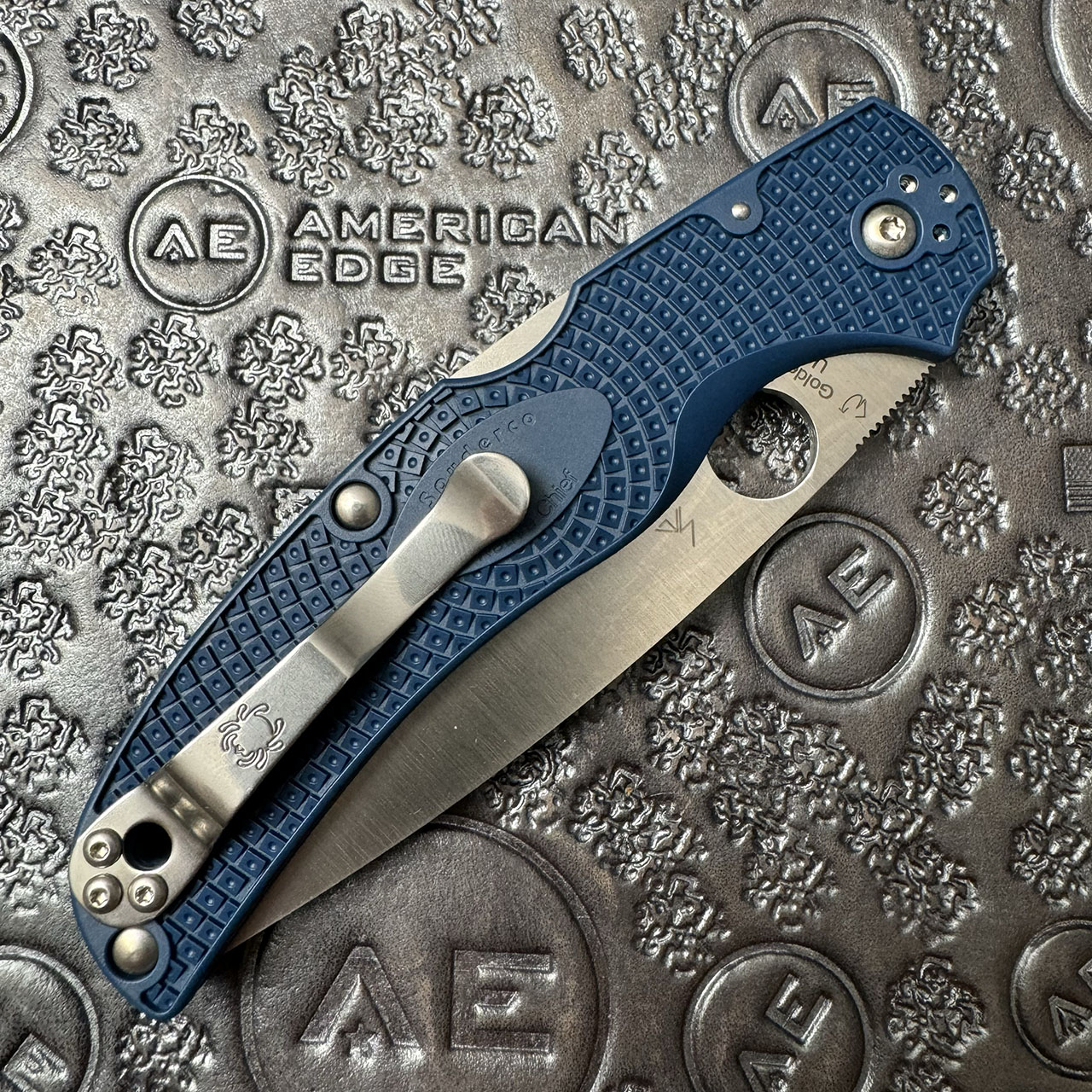 Developed in close cooperation with Crucible Industries, CPM-SPY27 is a cobalt enriched stainless steel that enhances the time tested chemistry of Japanese VG-10 with the Crucible Particle Metallurgy (CPM) process. This state of the art method wrings maximum performance out of the steel by reducing alloy segregation and ensuring a fine, homogenous microstructure. Proprietary to Spyderco, this high performance blade material is renowned for its ability to get “sticky sharp,” while balancing edge retention, toughness, and corrosion resistance. This Native Chief Lightweight proudly showcases this elite steel in its full flat ground blade and further highlights it with a signature cobalt blue FRN handle. New in box.