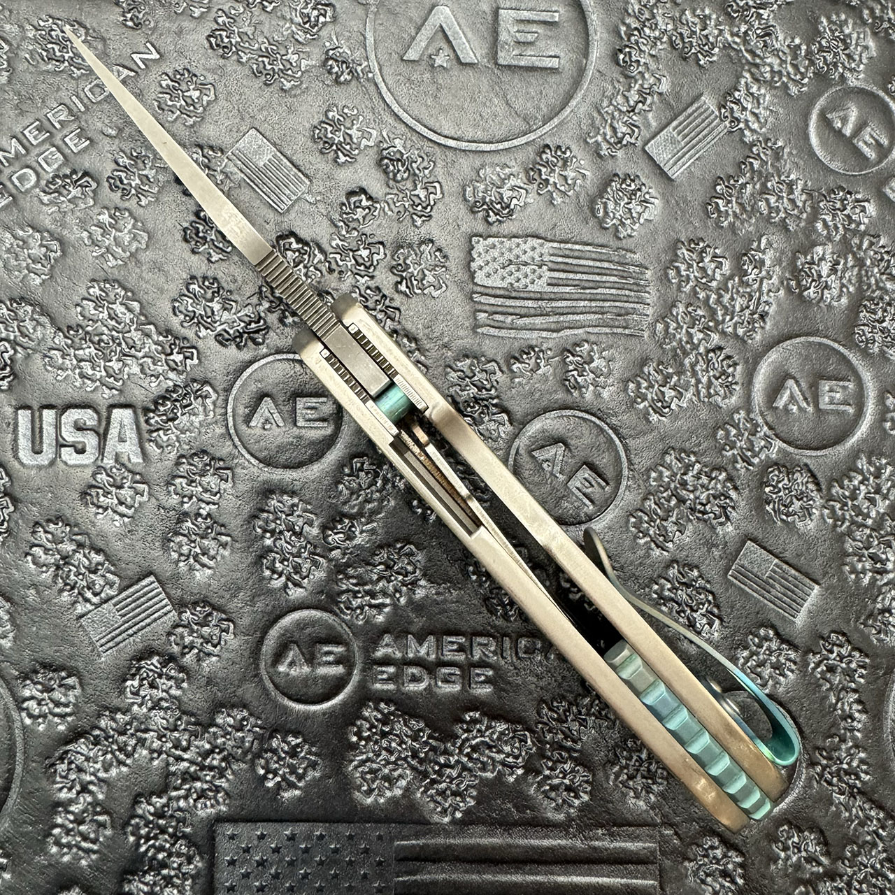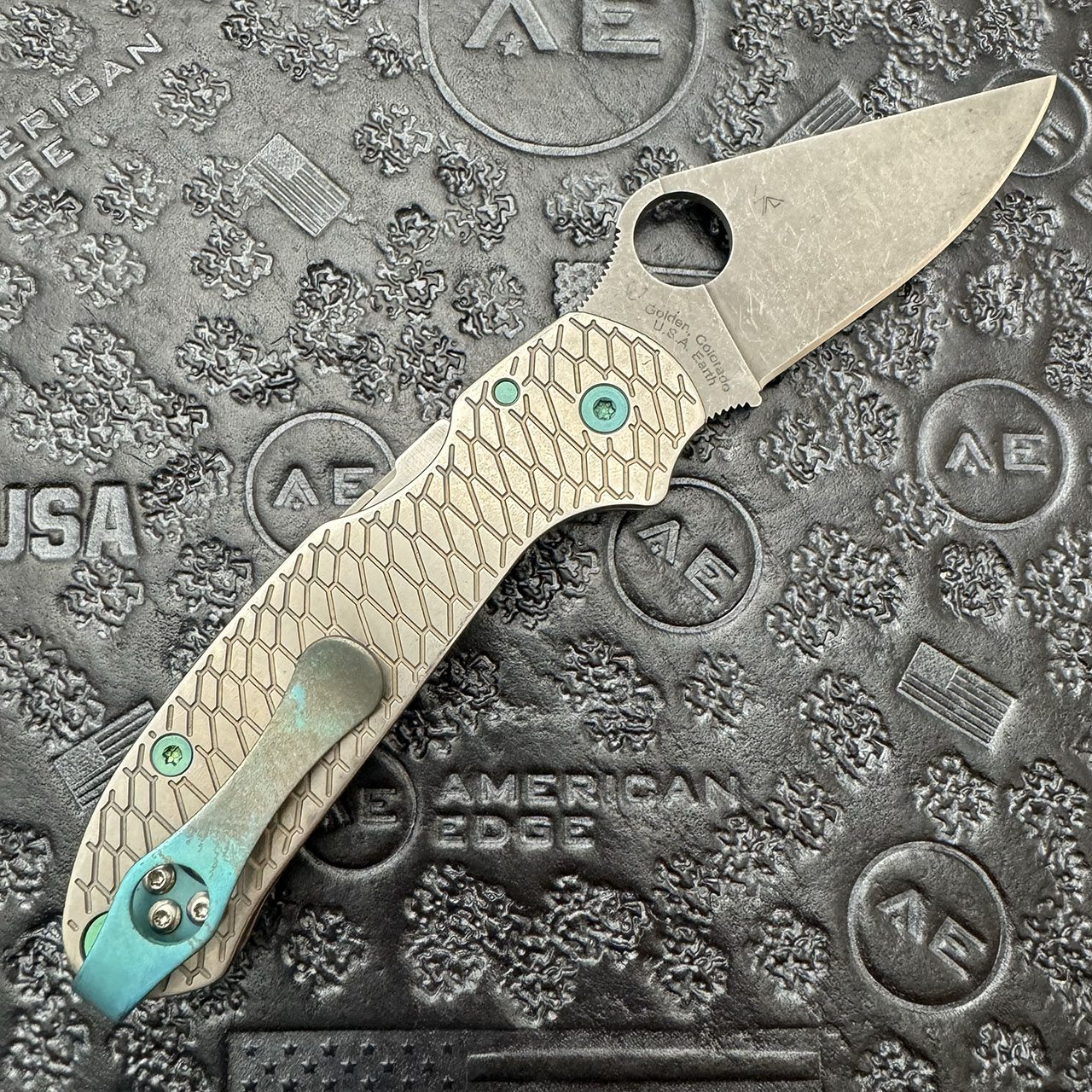 This pre-owned customized model features titanium handle scales. Custom acidwashed and sharpened CPM-S45VN stainless steel clip point blade. All titanium harware, lanyard tube plug, backspacer, and deep carry pocket clip that have been anodized in an antique Tiffany blue. Has some wear, with most being on clip. No box.