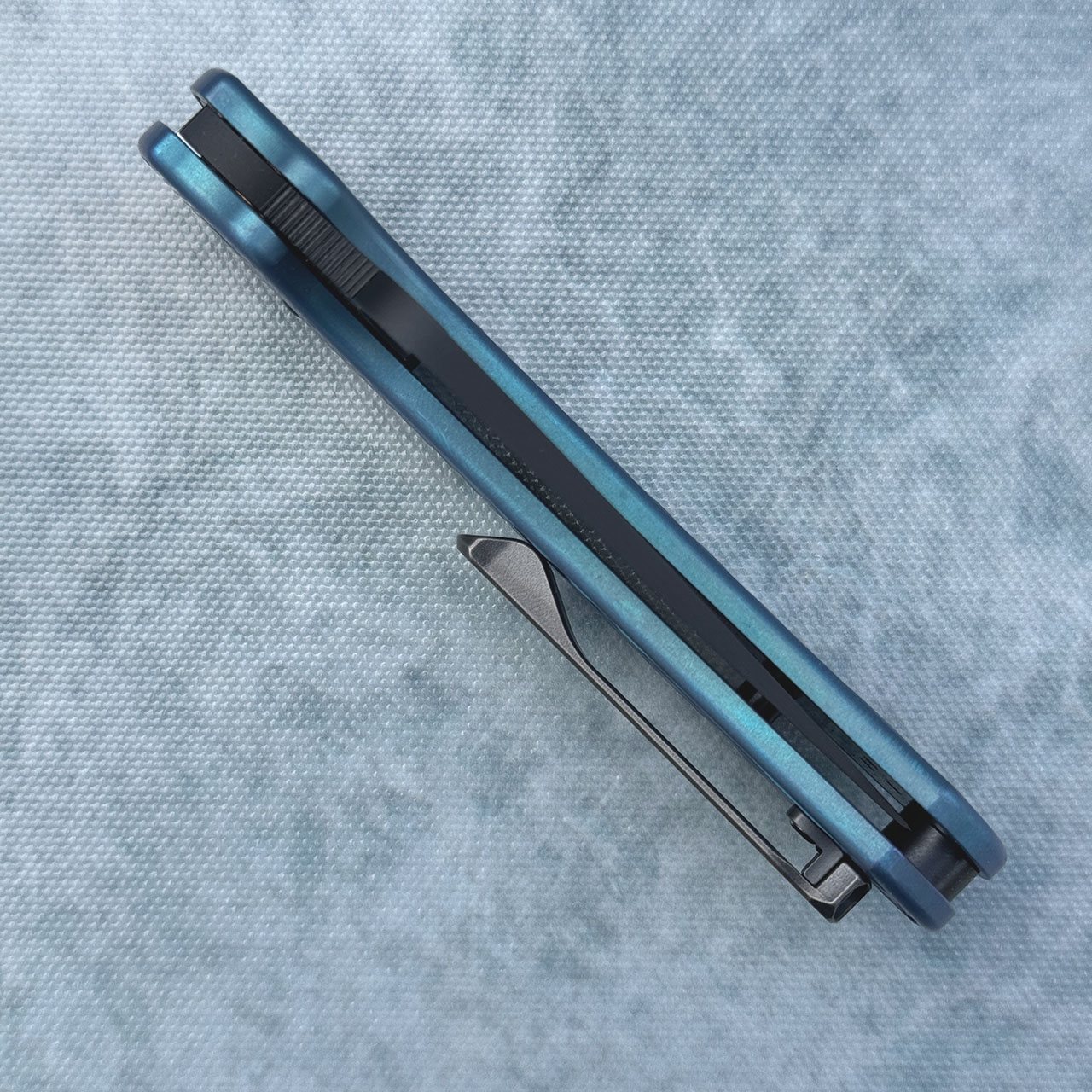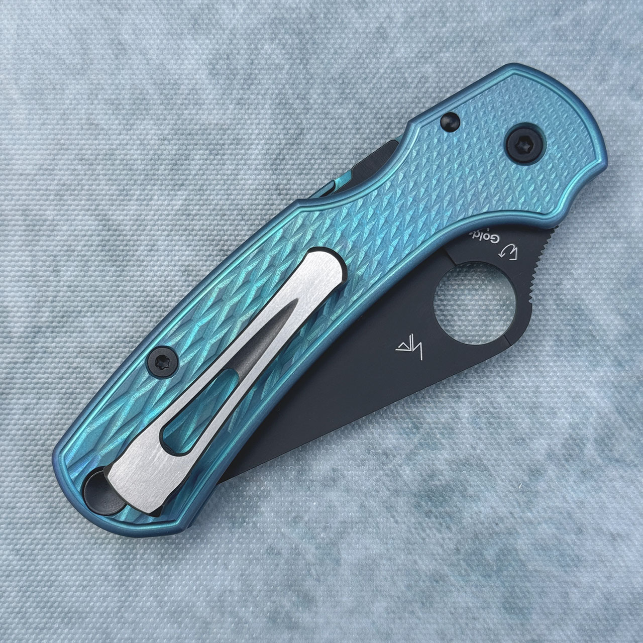 This customized model features barclaycnc titanium anodized handles. DLC CPM-S45VN stainless steel clip point blade. Black lanyard tube plug, and lynch nw modular pocket clip. In excellent condition with box from the camo s45vn model.