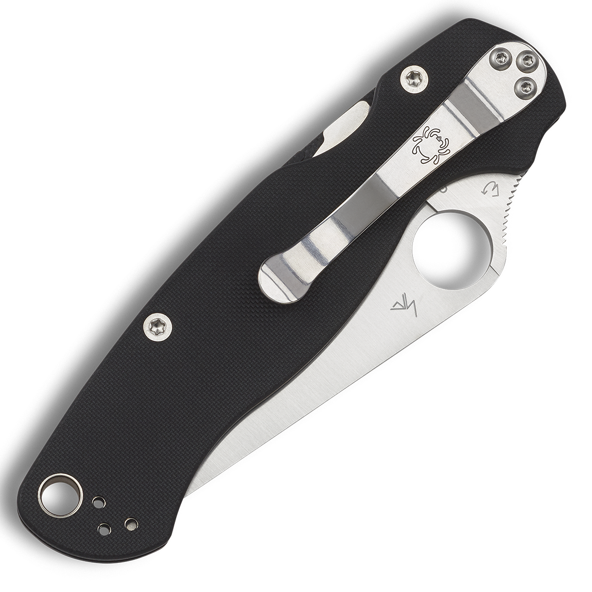 This model features black G-10 handle scales. Satin finished CPM-S45VN stainless steel clip point blade with a fully serrated SpyderEdge cutting edge. Satin finished hardware and a polished pocket clip. Brand new in box.