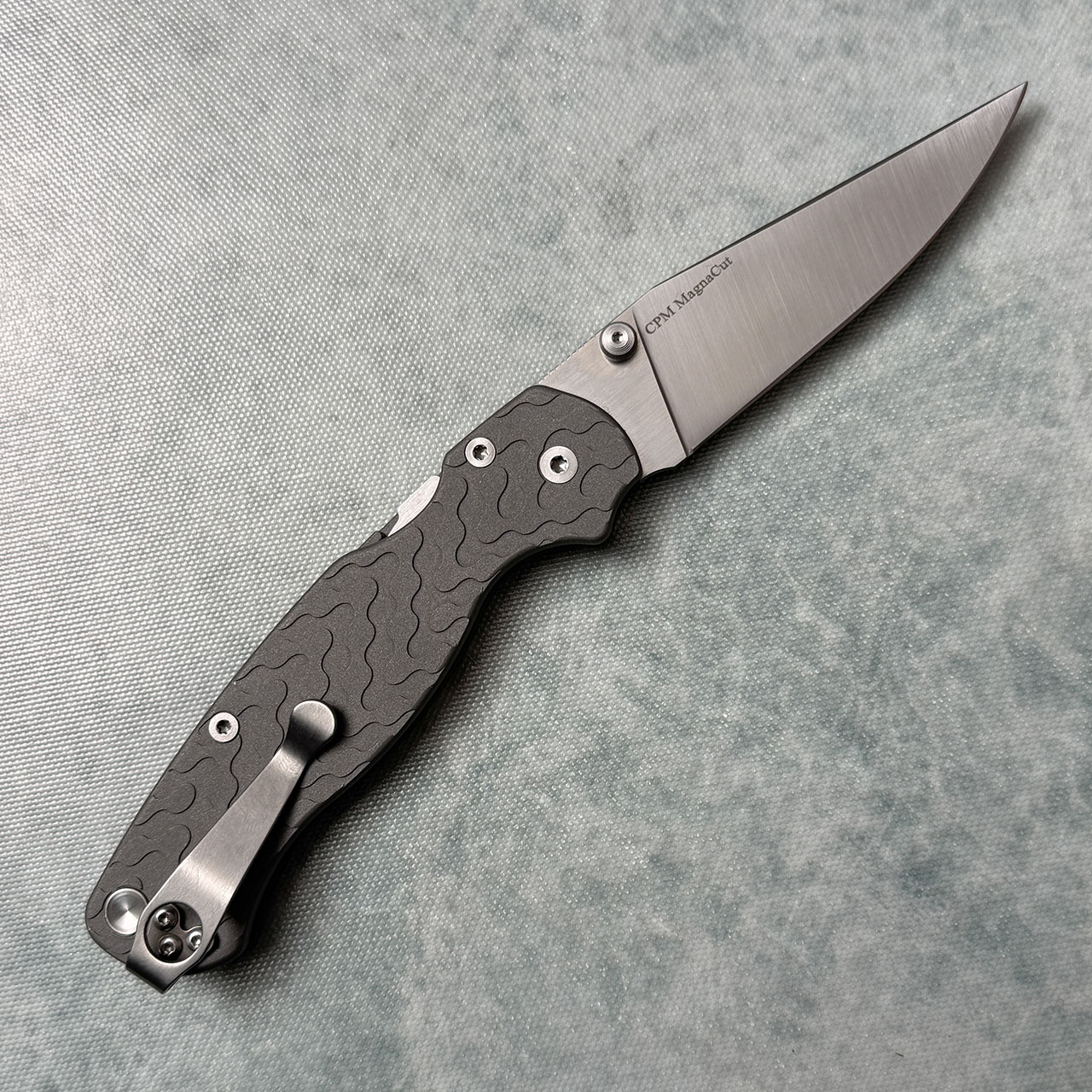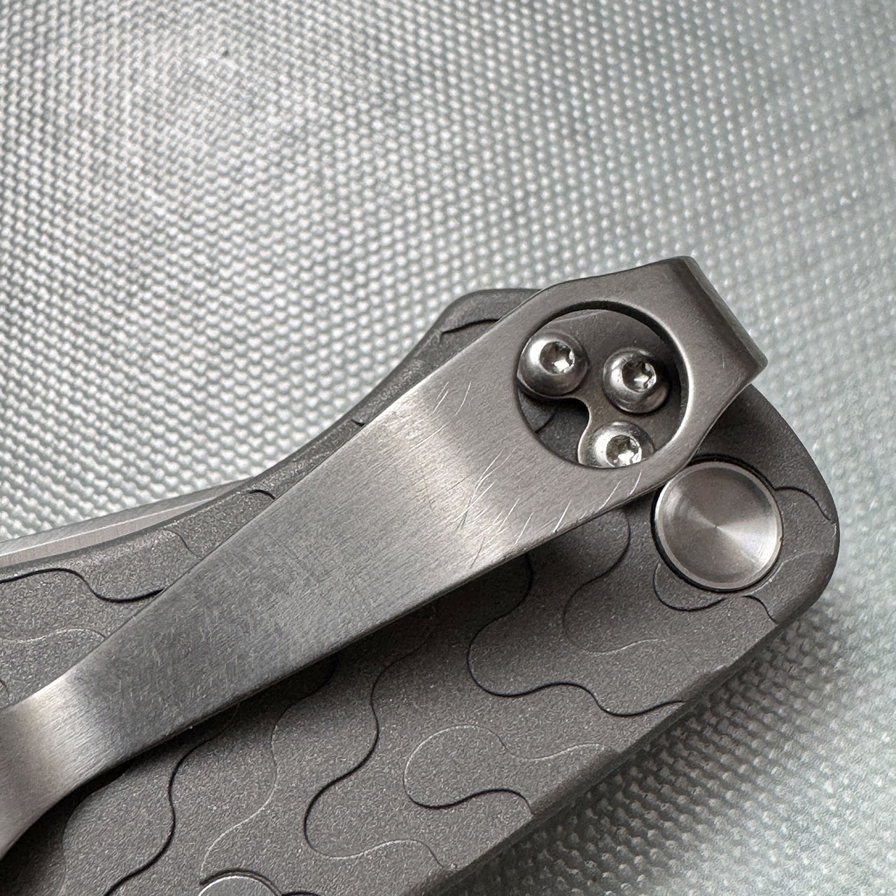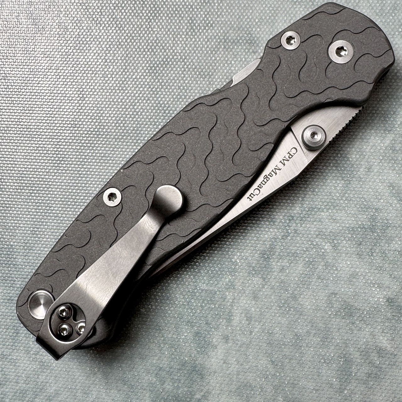 This model features rockscale designs titanium handle scales. Satin finished CPM-MagnaCut reblade by Gersh Blades. Deep carry pocket clip. Lanyard delete tube. Clip has some wear otherwise in good shape! Comes with a spyderco box.