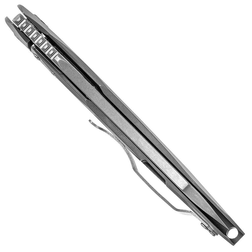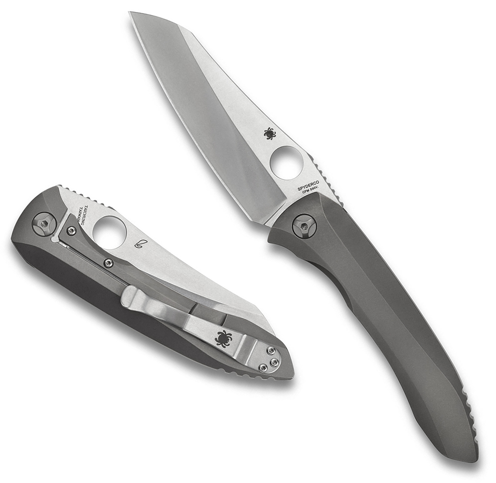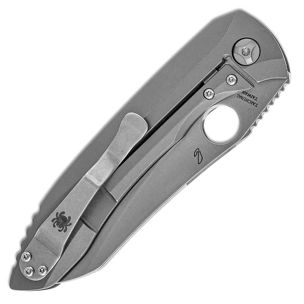 The Peter Rassenti designed Paysan (pronounced pie-zaan) is a sophisticated and well crafted manual folder. It features a one piece integral handle machined from solid titanium. Stonewash finished CPM-S90V stainless steel blade with a unique saber-ground wharncliffe blade that is 4mm thick. Spyderco's TradeMark Round Hole allows for ambidextrous, one-handed opening. The blade rides on ball bearing washers for a super smooth action. The integral handle includes a frame lock with a stainless steel interface to provide a long life and it allows acts as an over travel stop. A stonewash finished pocket clip for right side, tip up carry and a lanyard hole complete this knife. This is an exciting collaboration between Peter Rassenti and Spyderco. Brand new in Spyderco zip up pouch.