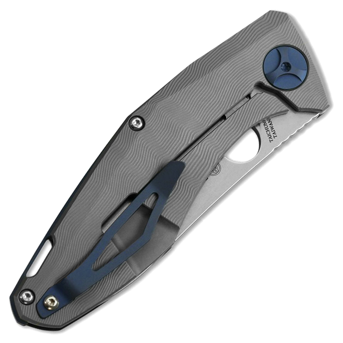 Featuring a titanium rear scale with steel reinforced integral frame lock, the scale is "webbed" to reduce weight. The front scale is solid carbon fiber with a nested stainless steel liner. Both scales are machined with the “drunken” texture that gives the knife an excellent grip. The knife is accented by blue anodized back spacer, pivot assembly, and tip up carry pocket clip. The drop point blade is full flat ground from CPM-S90V stainless steel with a tumbled stonewash finish. This is a fantastic, surprising lightweight design by Dmitry Sinkevich and brought to life by Spyderco. Brand new in box.