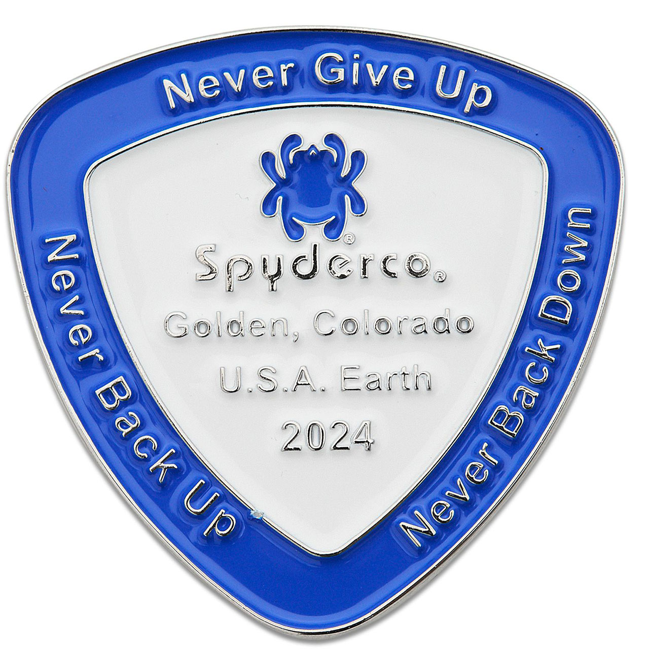The 2024 SpyderCoin honors Spyderco’s unwavering support of our nation’s law enforcement and military personnel and their dedication to preserving our way of life. A vivid reflection of our company values, it reminds us that “It is the responsibility of good to stop evil from hurting the innocent,” and encourages us to “Never give up,” “Never back up,” and “Never back down.” This coin is custom minted in a unique Reuleaux triangle shape, color filled with blue and white enamel, and proudly bears the Spyderco logo and the year “2024.” New in plastic slip.
