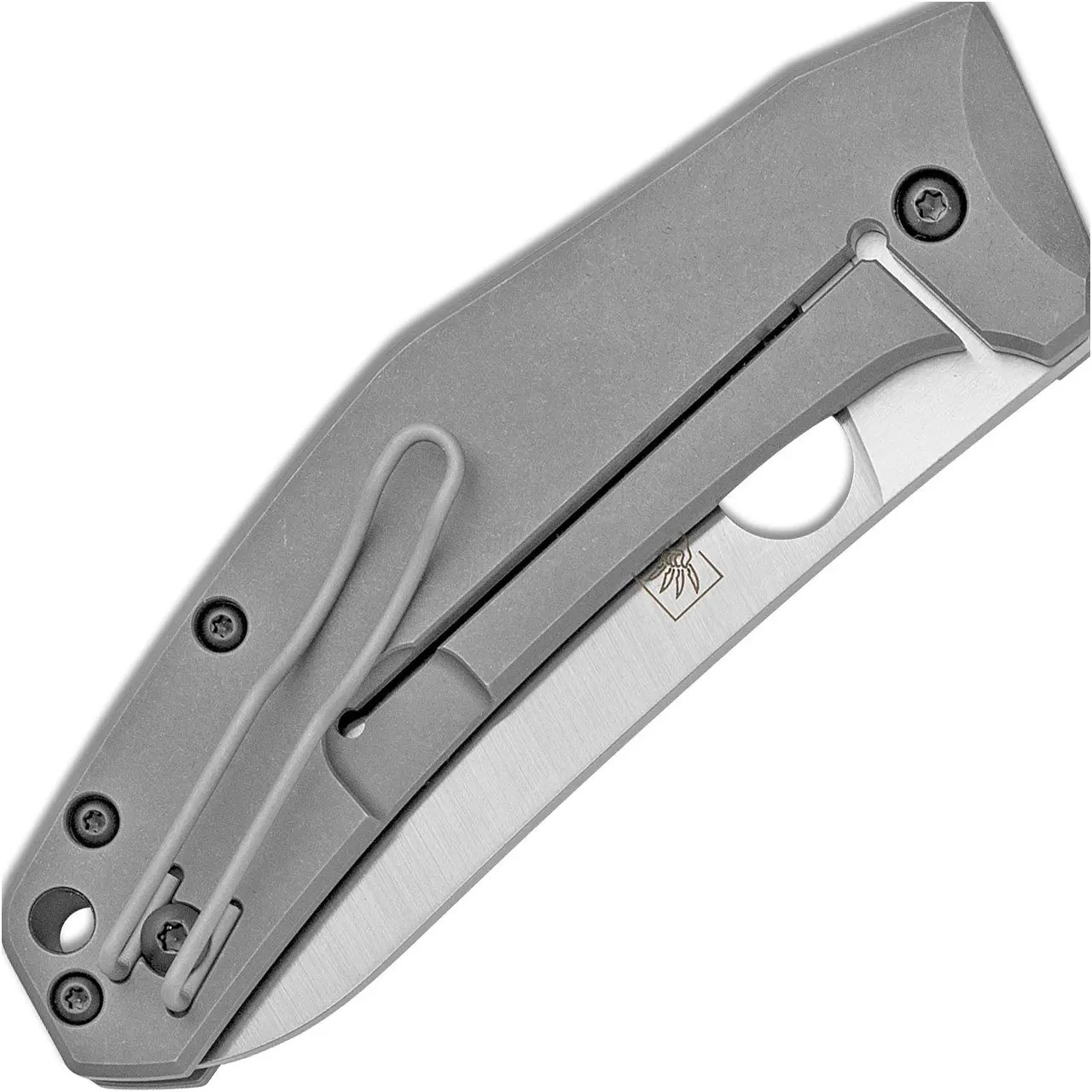 To reduce weight, optimize balance, and simplify cleaning, the Spydiechef features an open backed handle constructed with two precision machined solid titanium scales. The reverse side scale houses a stout Reeve Integral Lock (R.I.L.) mechanism that locks the blade firmly open when in use. For additional security when working around water, the handle also includes a lined lanyard hole for easy attachment of safety lines and lanyards and a reversible deep carry pocket wire clip for convenient, ambidextrous carry and quick tip up access. Brand new in box.