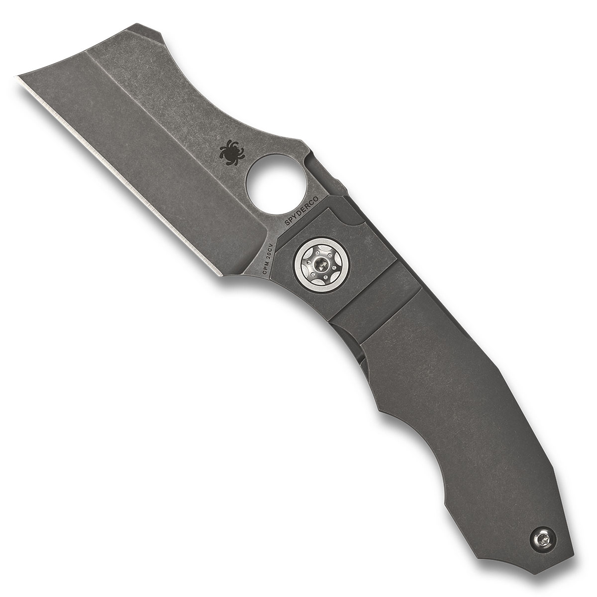 Inspired by custom knifemaker David Rydbom’s “Bill the Butcher” design, the Stovepipe blends dramatic style with serious performance. Its stout cleaver style blade is crafted from 4mm thick CPM-20CV stainless steel and has a deep hollow grind for superior edge geometry. The handle is constructed from two slabs of solid titanium joined by a titanium backspacer. Both scales are painstakingly machined to create beautifully crowned outer surfaces and the reverse side scale forms the foundation of the (R.I.L.) frame lock mechanism. The oversized pivot pin is machined with artistic accents and serves double duty as an overtravel stop for the lock bar. Includes a right hand tip up machined titanium clip. The clip, scales, backspacer, and blade all feature a dark, industrial style stonewash finish. Brand new in Spyderco zip up pouch.