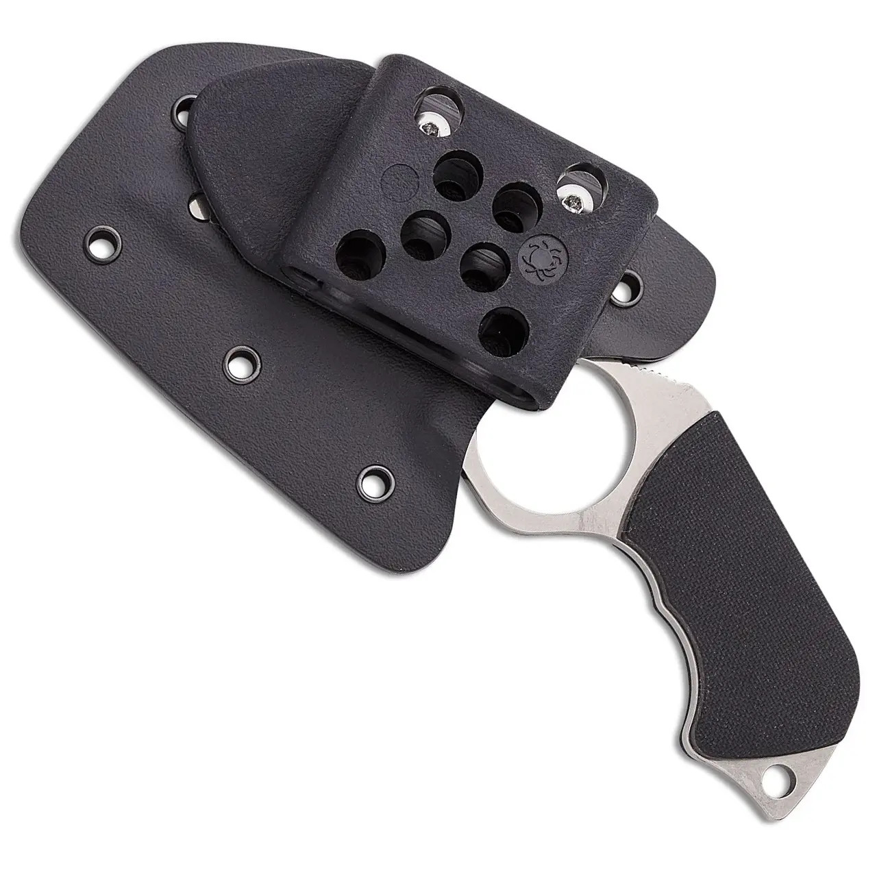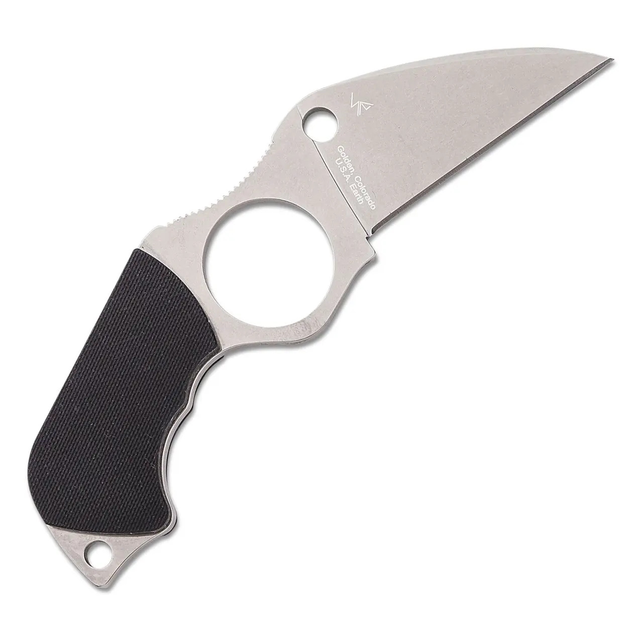 Designed by Spyderco founder Sal Glesser and inspired by the groundbreaking innovations of French knifemaker Fred Perrin, the Swick is a purpose designed personal defense tool. Its most distinctive feature is a Perrin inspired index finger hole that locks the knife into the user’s hand for superior grip security. Sized for a man’s hand, the 1.03 inch diameter (26.1mm) hole is flanked by a full flat ground Wharncliffe blade and a full tang, pistol grip style handle. Concealed internal pins secure a pair of peel ply textured scales to the handle, and a strategically placed section of jimping on the spine provides a non slip thumb ramp.