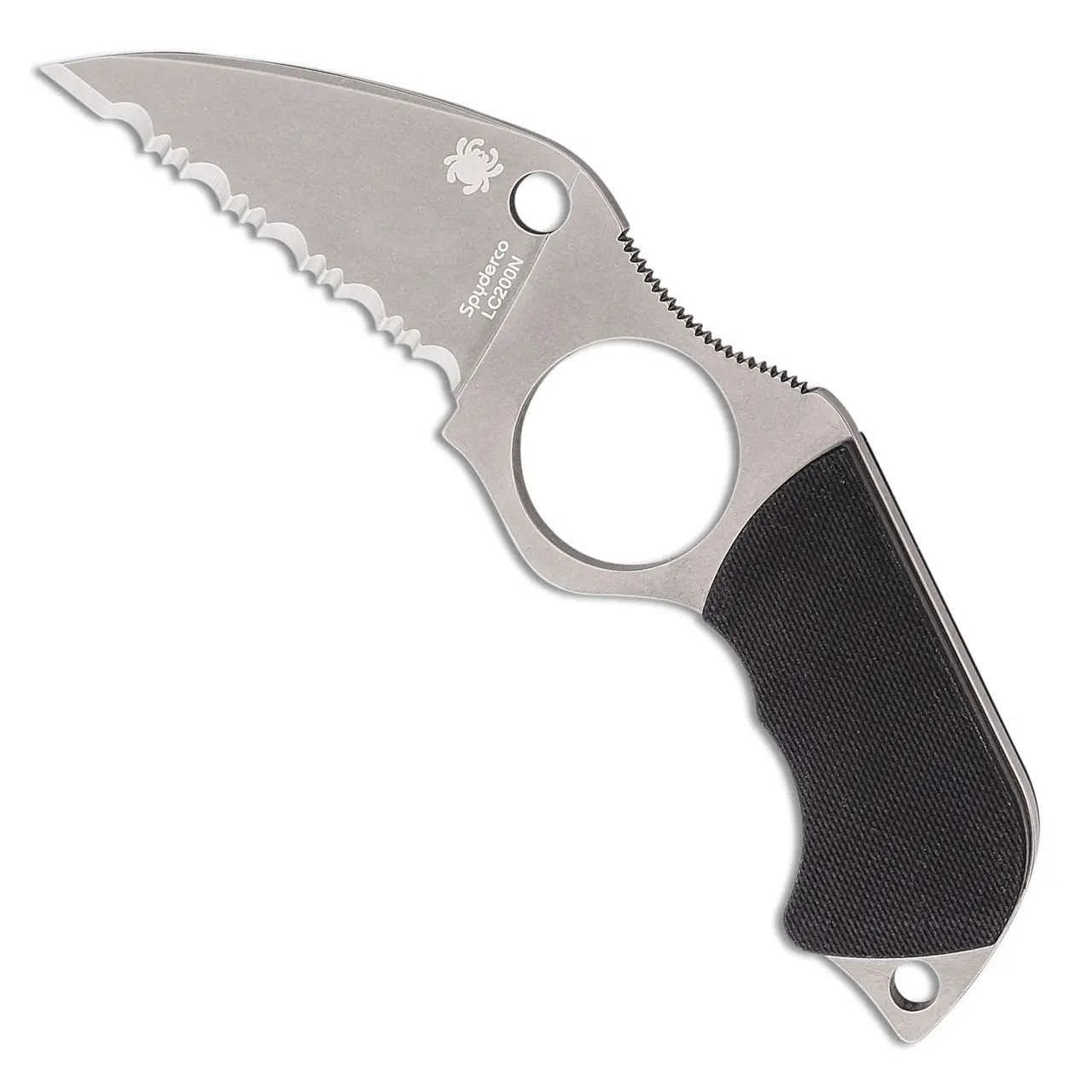 Designed by Spyderco founder Sal Glesser and inspired by the groundbreaking innovations of French knifemaker Fred Perrin, the Swick is a purpose designed personal defense tool. Its most distinctive feature is a Perrin inspired index finger hole that locks the knife into the user’s hand for superior grip security. Sized for a man’s hand, the 1.03 inch diameter (26.1mm) hole is flanked by a full flat ground Wharncliffe blade and a full tang, pistol grip style handle. Concealed internal pins secure a pair of peel ply textured scales to the handle, and a strategically placed section of jimping on the spine provides a non slip thumb ramp.