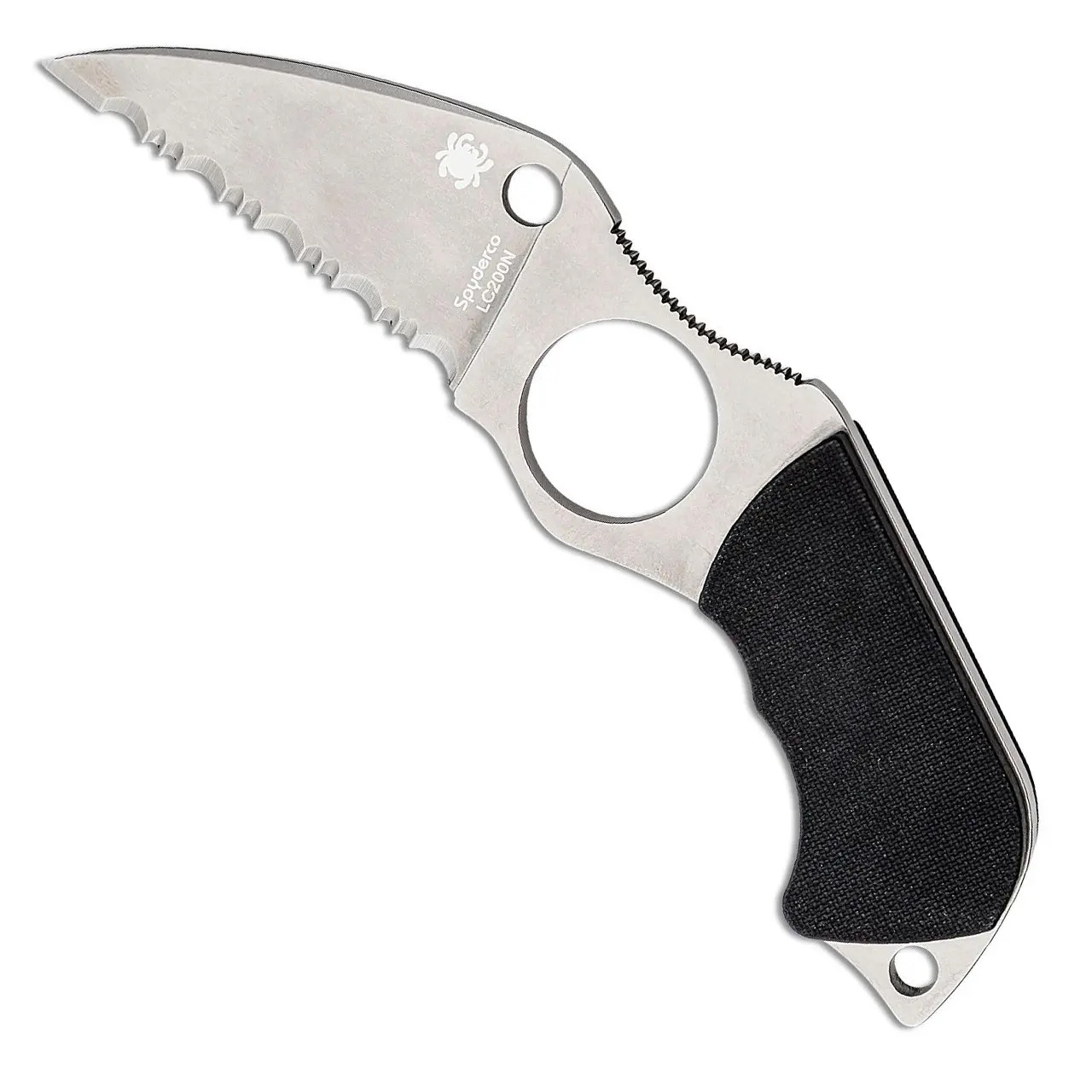 Spyderco Swick 6 Small Hole Fixed Blade Black G10 Handles Satin LC200N Serrated Blade FB14S6