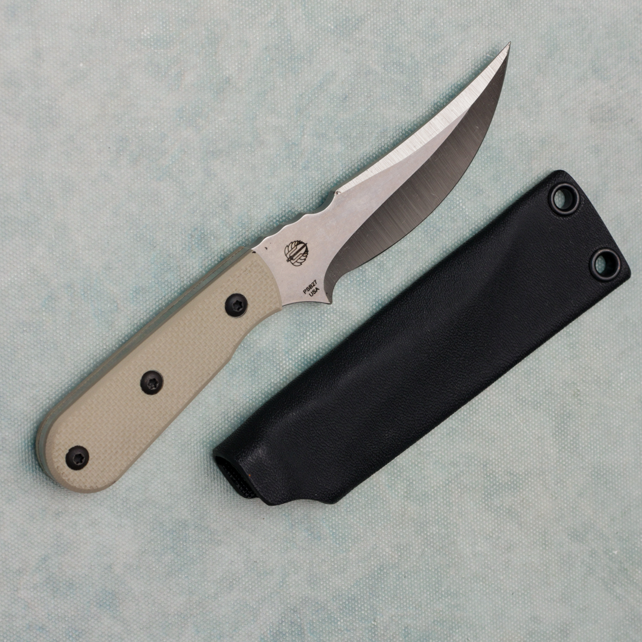 This Persian fixed blade model features a stonewash PSB27 blade with tan G-10 handle scales. Brand new with kydex sheath.