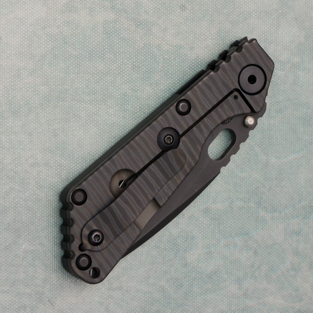 This SNG model features a black CPM-20CV blade with black textured G-10/strider stripe titanium handle scales. Comes in baggie, has one very small mark on clip, and a couple minor marks on blade.