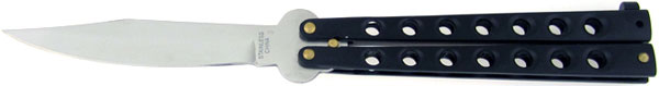 Black coated skeletonized aluminum handle scales. Mirror polished stainless steel clip point blade. Brass handle pins and matching black latch. Another great inexpensive butterfly knife. Brand new in box.