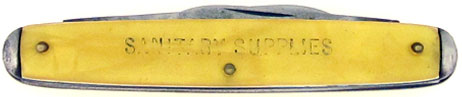 Awesome cracked ice celluloid handle scales, the front says UNIVERSAL LABORATORIES MEMPHIS and the back says SANITARY SUPPLIES. High carbon steel spear point blade and pen blade. The blades have good snap. Brass handle pins. Steel end cap bolsters and liners. Proudly made in the U.S.A. in the 1930's. Antique Syracuse advertising pen knife.