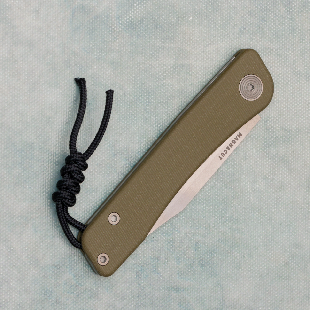 This particular model is even more lightweight and amazing!! It features a stonewash finished CPM-MagnaCut stainless steel clip point blade with standard cutting edge. Green g-10 handle with black lanyard. Brand new in box.