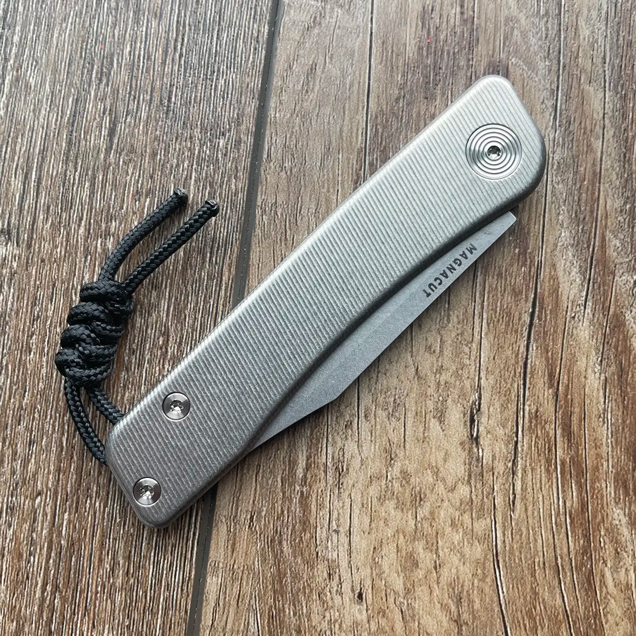 This particular model features a stonewash finished CPM-MagnaCut Stainless Steel clip point blade with standard cutting edge. Titanium handle with black lanyard. Brand new in box.