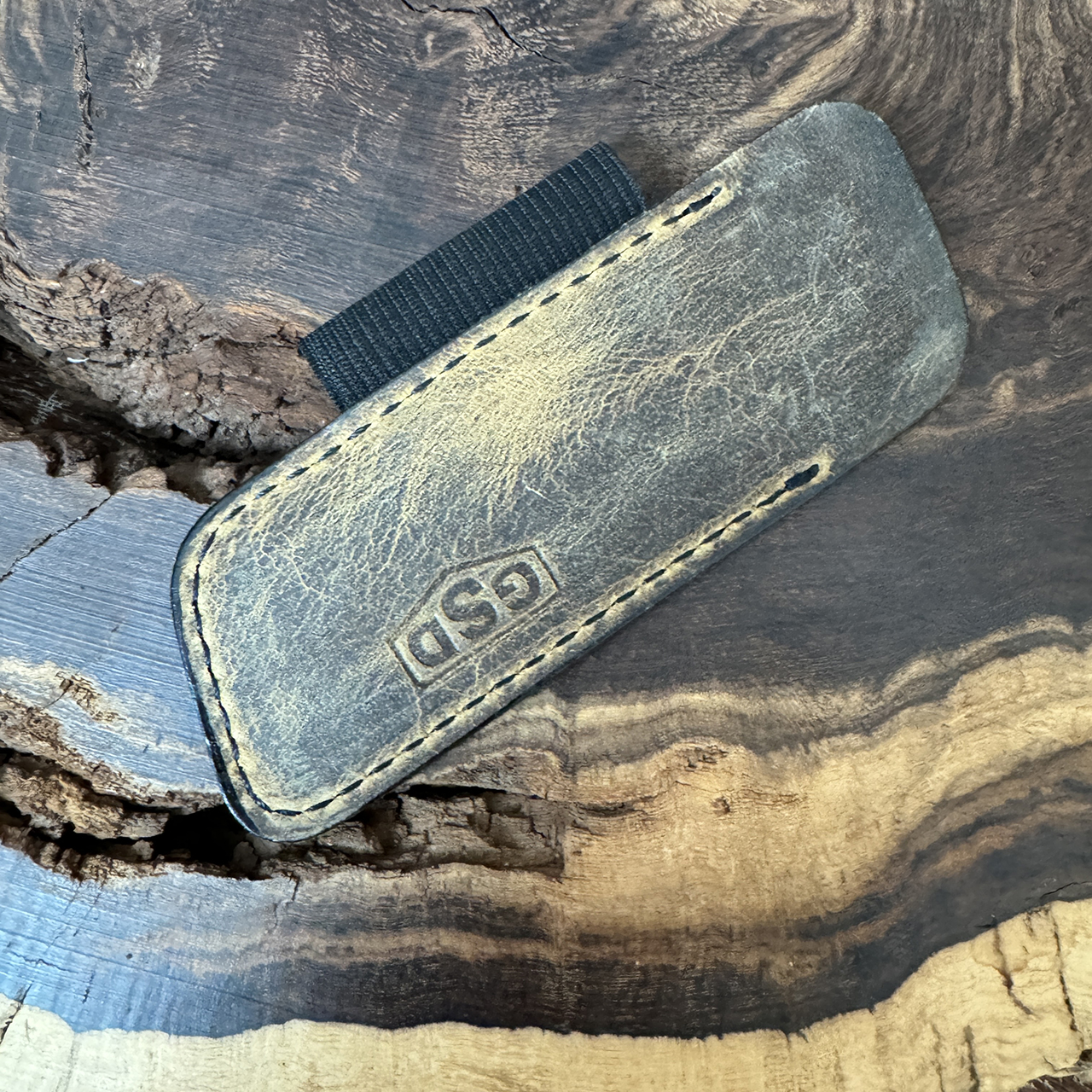 Handcrafted by Greg Stevens Design, these leather slips were created specifically for the Bexar to keep the thinness and follow the design lines. These are excellent to store your knife in or carry with you everyday. Knife and pen not included. Made in the USA.