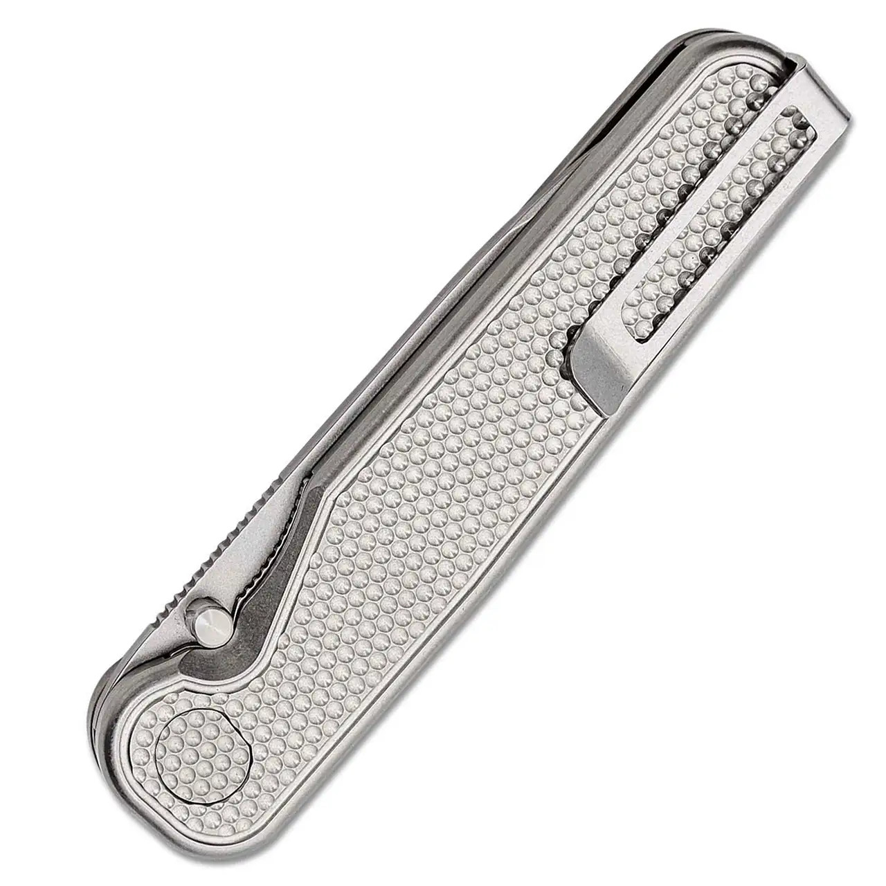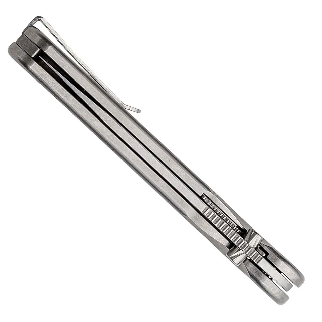 This particular model features a stonewash finished CPM-Magnacut drop point blade with standard cutting edge. Golf Ball Pattern Machined Grade 5 Titanium handle. Thumbstud opening mechanism. Brand new in box.