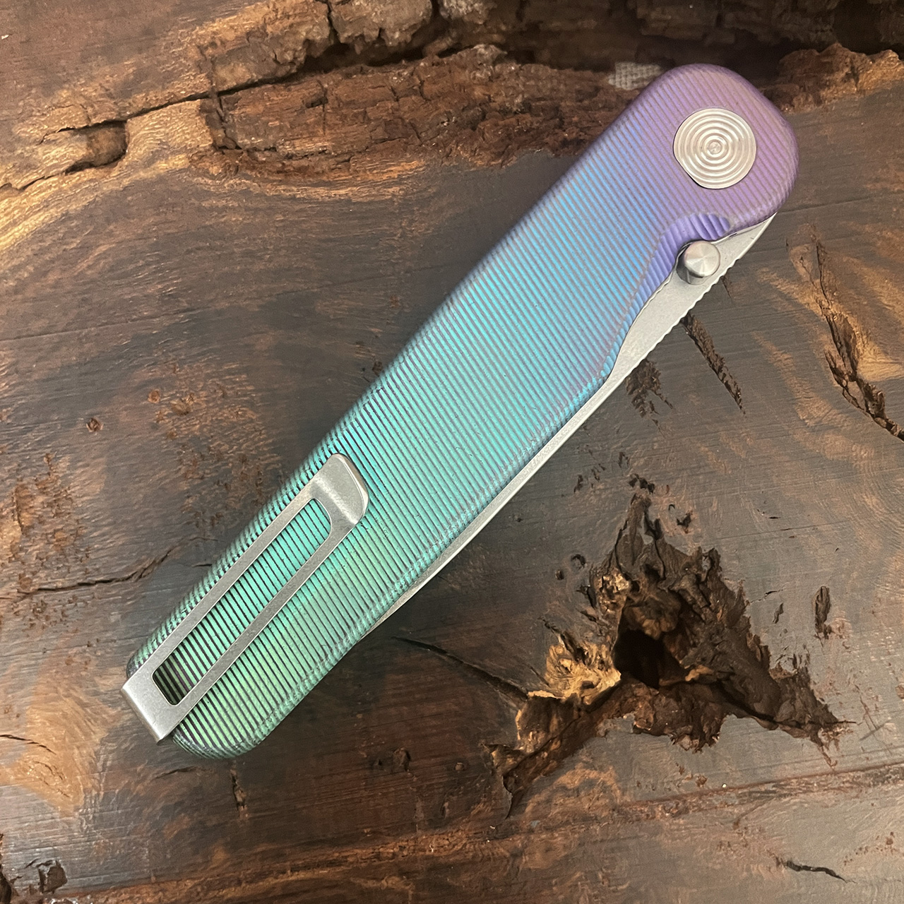 This model features stonewash finished flat titanium handle scales that have been modded in house. Stonewash finished CPM-Magnacut stainless steel drop point blade. Thumbstud opening mechanism and liner lock for easy operation. Tip up deep carry pocket clip. Brand new in box.