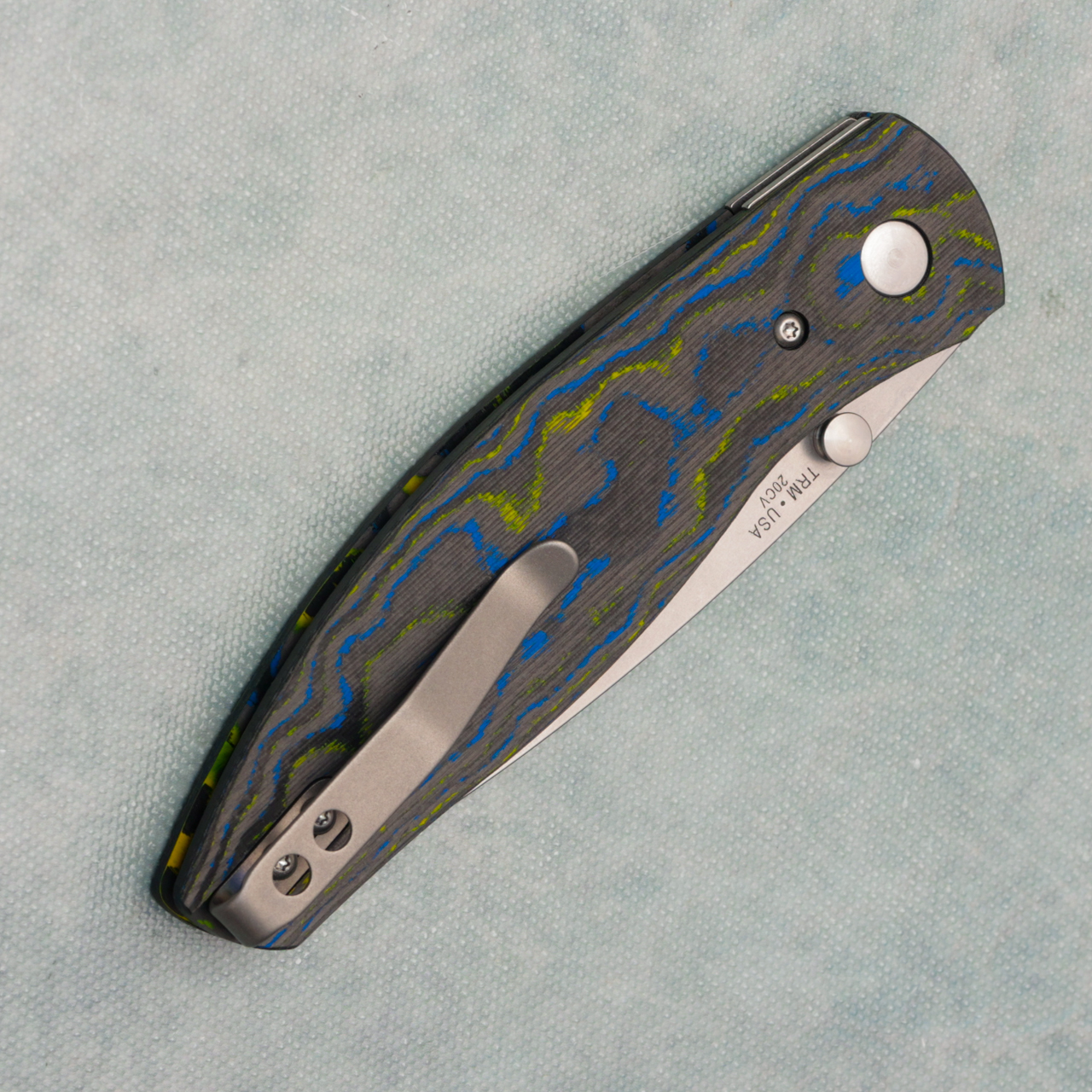 Three Rivers Manufacturing TRM Atom Liner Lock Bolts Camo Carbon 3D Contoured Scales Stonewashed 20CV Blade