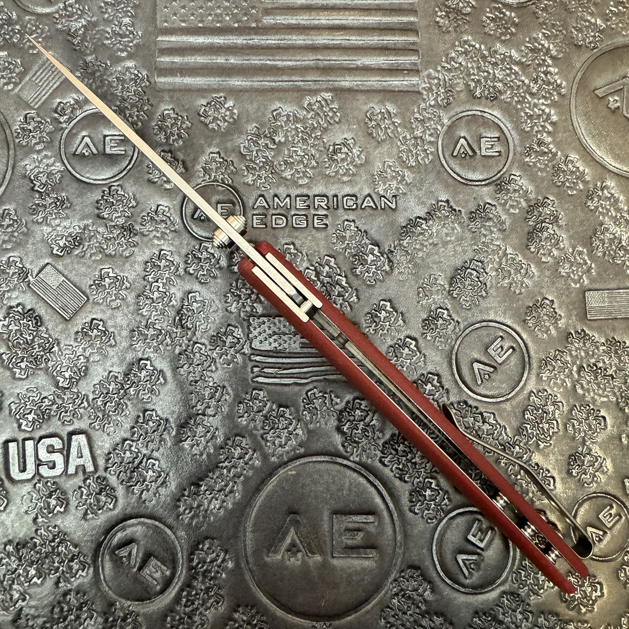 This model comes with lizard skin textured ruby red G10 scales, and a CPM-MagnaCut stainless steel blade, and TRM's new thumbstuds. Right hand tip up carry only. Brand new in box.