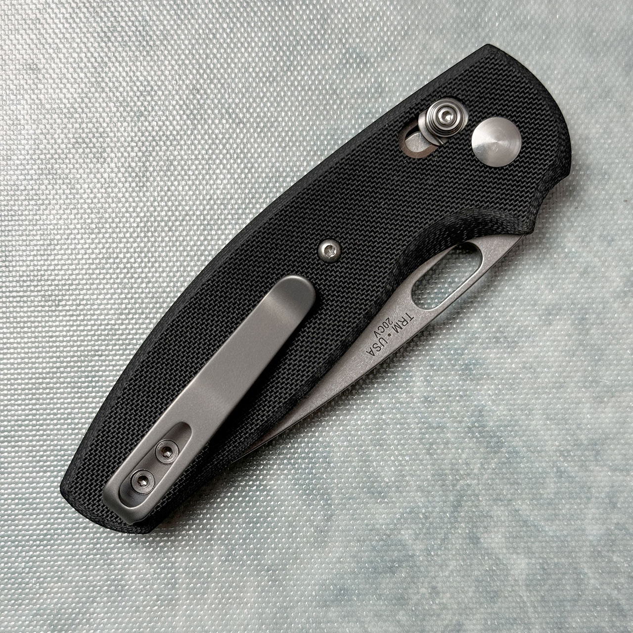The bulldog is a perfect sized edc knife, featuring TRM's river-LOK. This model comes with jet black g10 scales, and a CPM-20CV stainless steel blade. Right hand tip up carry only. Brand new in box.