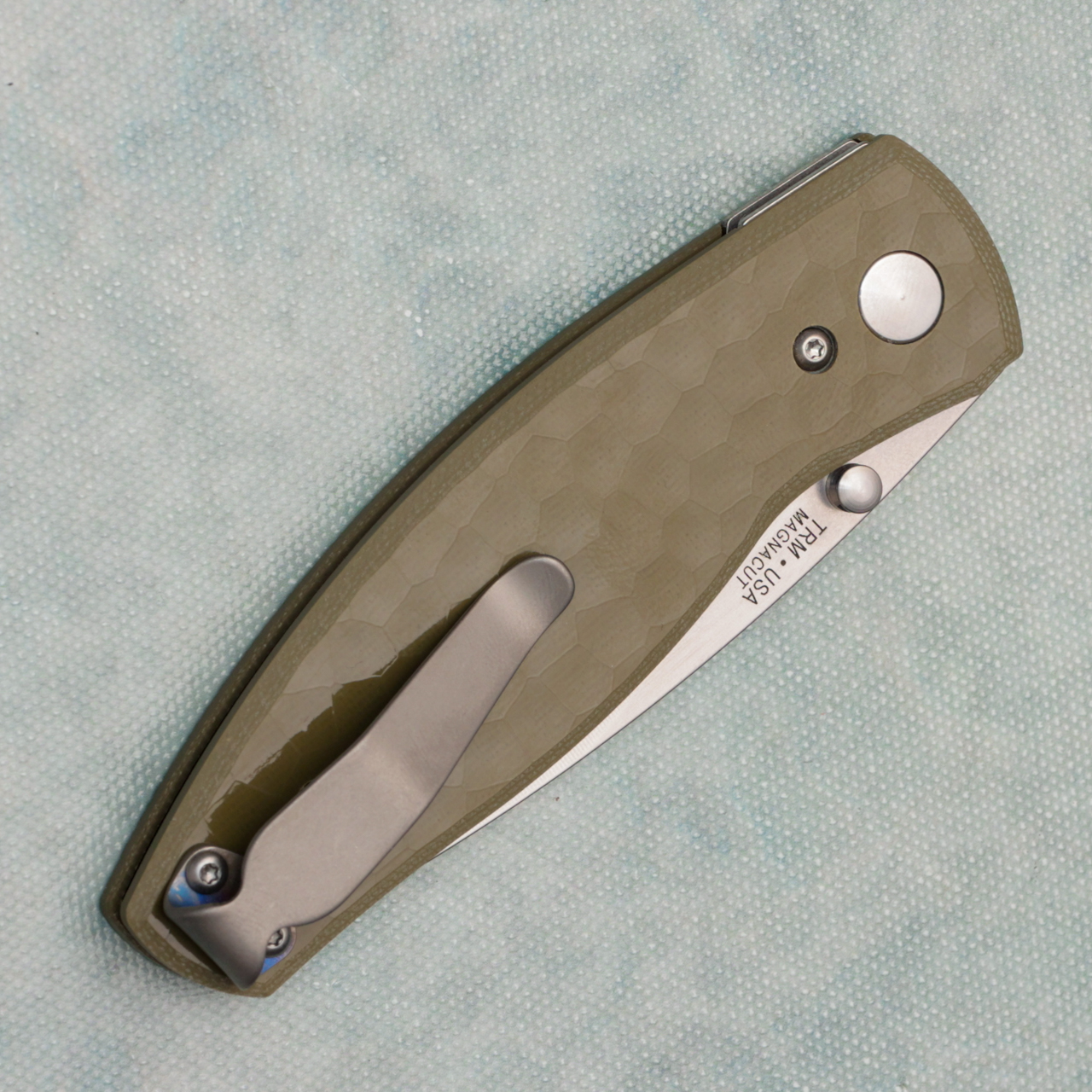 Three Rivers Manufacturing TRM Neutron 2 Liner Lock OD Green Turtle Shell Flat G10 Handles Stonewashed MagnaCut Blade