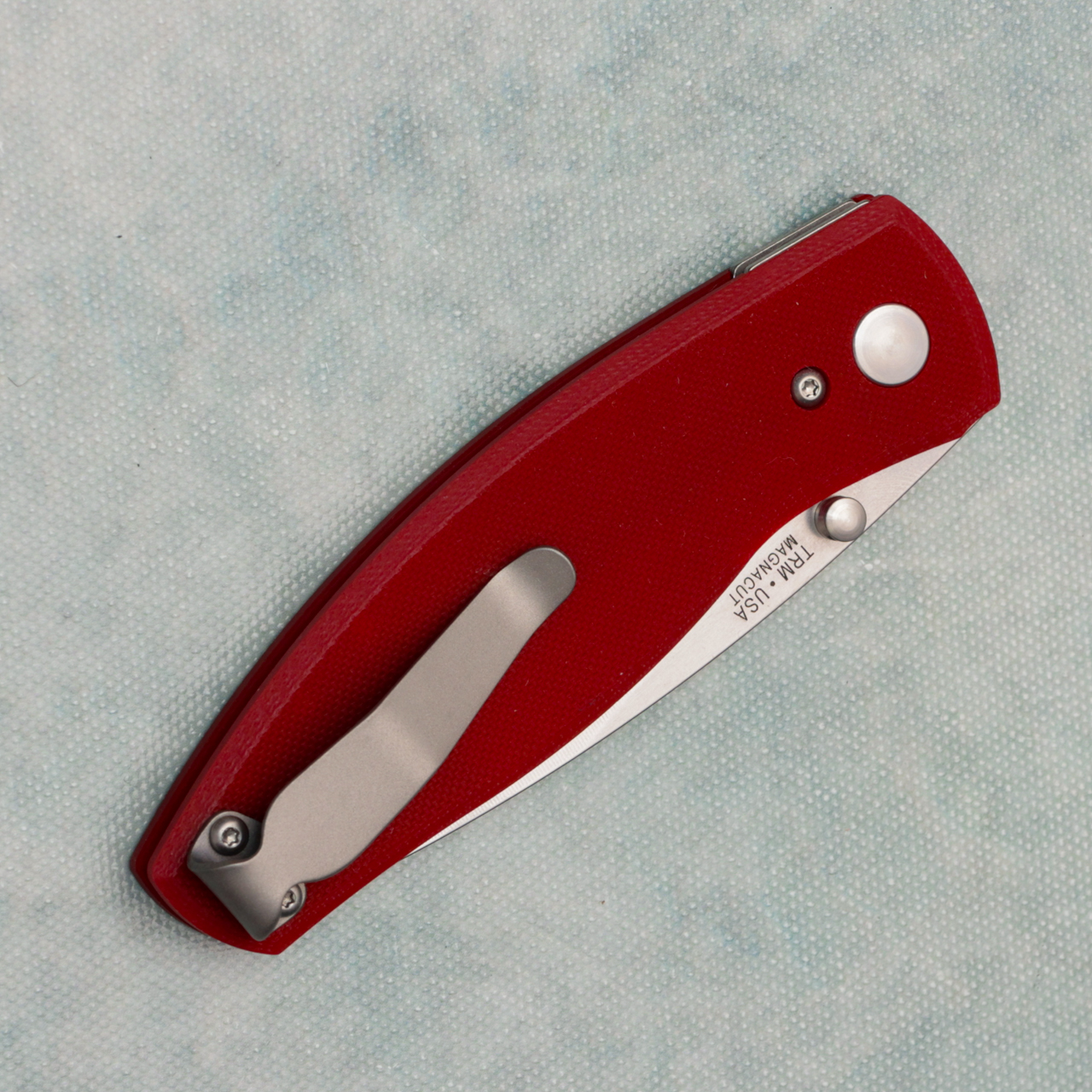 Three Rivers Manufacturing TRM Neutron 2 Liner Lock Ruby Red Flat G10 Handles Stonewashed MagnaCut Blade