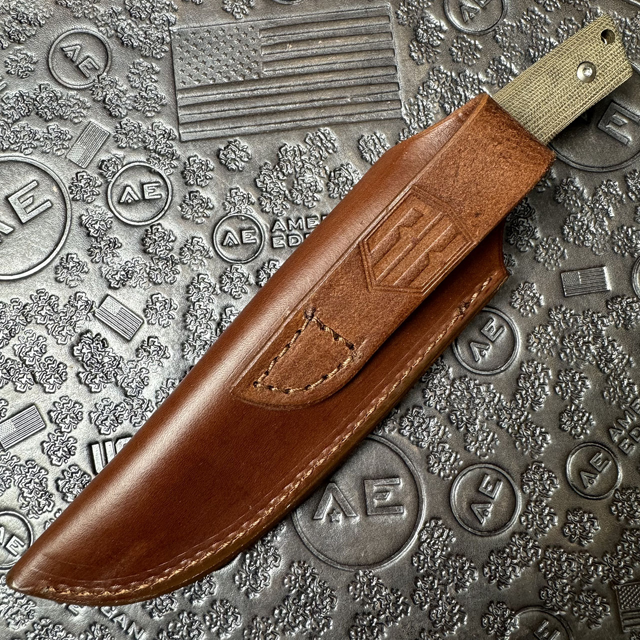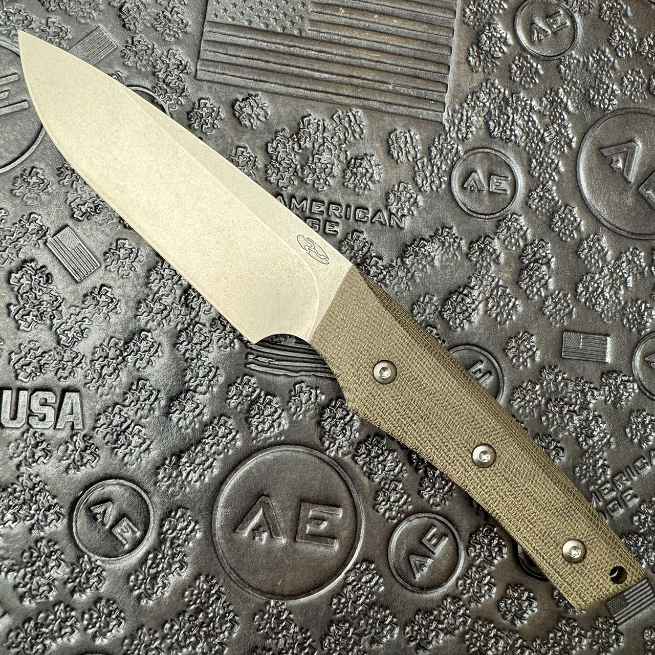 This beautiful fixed blade features a CPM-20CV blade, and OD Green micarta handles. Comes with leather sheath. Brand new in packaging.