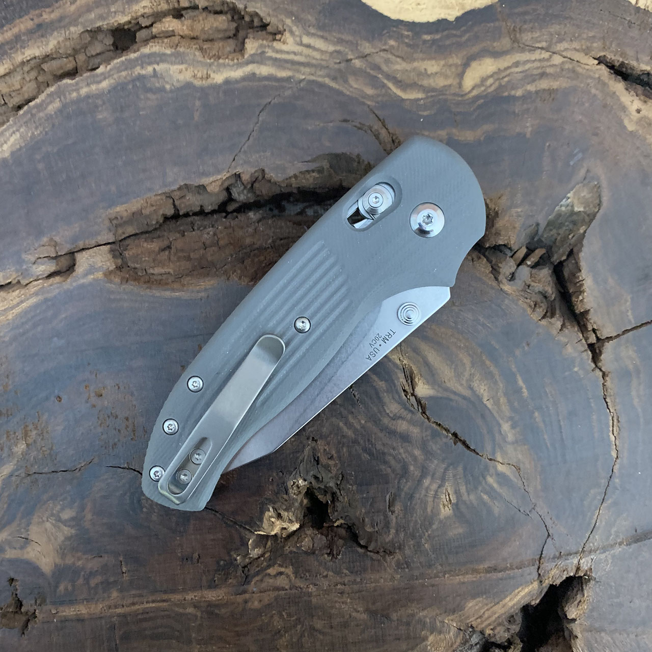 This model comes with slate gray G10 scales, and a CPM-20CV stainles steel blade. Reversible deep carry titanium pocket clip. Brand new in tube.
