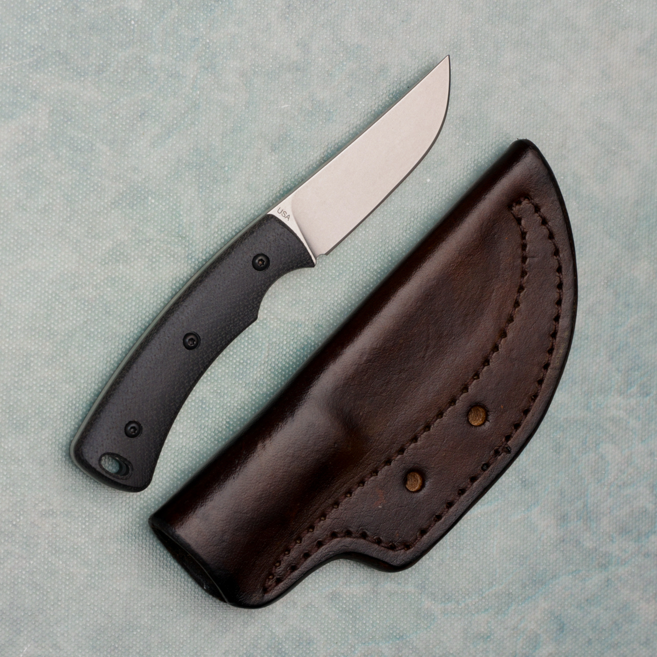 The Tagalong is a small EDC companion. This beautiful fixed blade features a CPM-MagnaCut blade, and black sand micarta handles. Comes with leather sheath and clip. Brand new in box.
