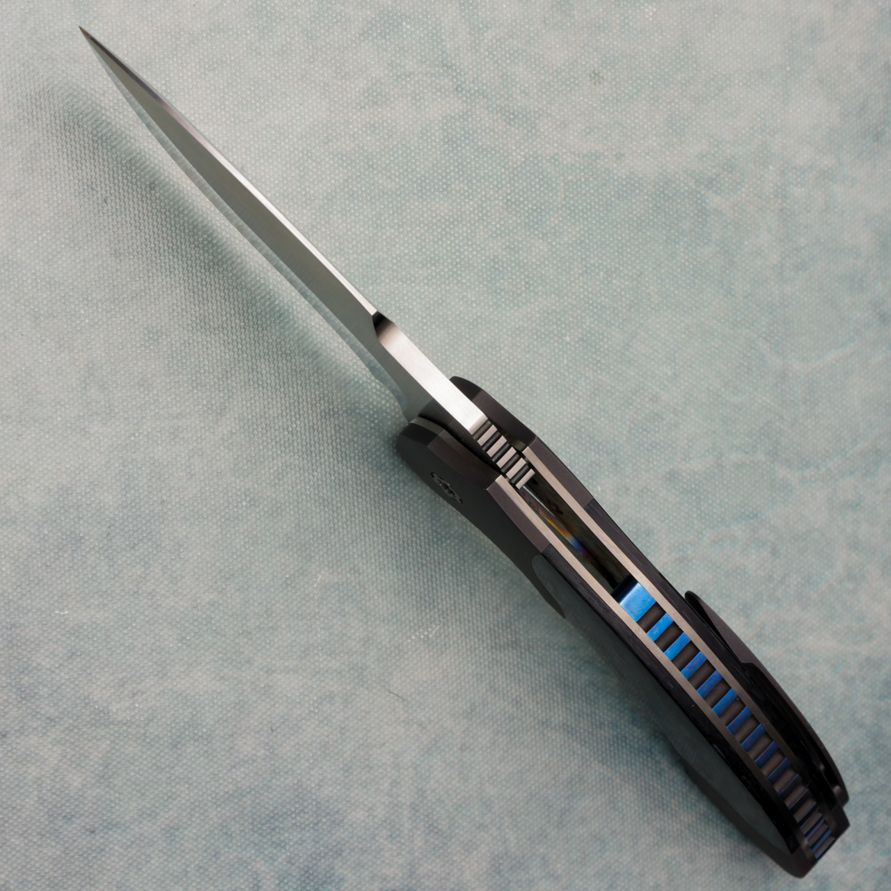 This custom Archangel features a satin spear point blade with notched thumb rest and flipper deployment. The handle has dark titanium bolsters and shred carbon fiber with titanium liners. Blue backspacer, and very smooth action. Knife is near mint condition from a collector, clip has a very few light marks, and one slight mark on front bolster, in pouch.