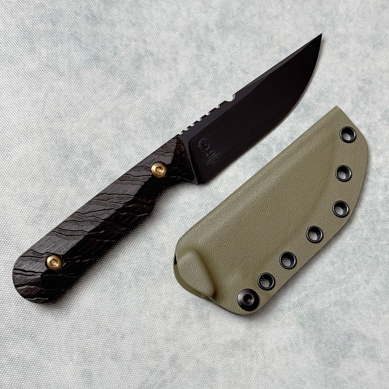 The handle is where the Administrator truly commands respect. Two distinctive materials are offered to suit the operator's style and environment. The first, crafted from ebony wood, exudes a dark, polished elegance that nods to the timeless craftsmanship of blades built to last generations. This version is paired with an OD green Kydex sheath and speaks to a sleek, tactical aesthetic. The second, hewn from ironwood, delivers unmatched density and durability, its rugged grain embodying the tenacity of those who depend on their tools for survival. This version has a tan Kydex sheath, reflecting its earthy, grounded reliability. Both handles are secured with robust brass hardware, completing the knife's industrial yet refined aesthetic.