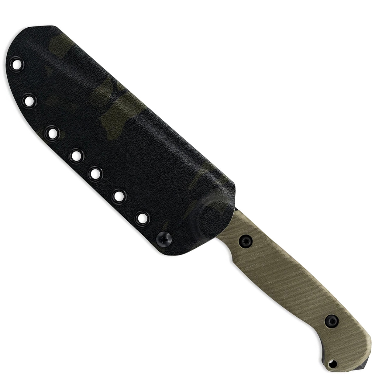 This model features a jungle green G10 Handle and a tiger stripe on black oxide CPM-3V blade. The CPM 3V blade is ground with a Hybrid Fuller™ to reduce the overall weight and bring symmetrical balance to the knife. The extra high flat ground bevel meets the swedge grind seamlessly, leading to the reinforced tip. The blade is assembled with Toor's custom turned hardware made from 303 stainless steel and is fitted with a fold over MultiCam® Black KYDEX® sheath. Comes brand new in box with sheath.