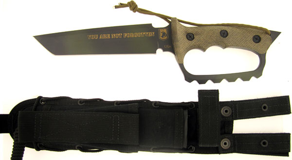 Grooved full tang construction with triangle protruding lanyard hole/skull crusher. Nylon lanyard. Awesome grooved and textured forest green micarta handle scales with three large black handle pins. Integral D Knuckle guard. High quality K-G Gun Kote finished O1 tool steel tanto combat style blade with semi-sharp spine. The blade is stamped YOU ARE NOT FORGOTTEN USA - TREEMAN KNIVES with the Treeman logo and POW MIA logo. Quality U.S.A. made nylon combat sheath. These knives are of superior quality and are bad ass to boot. Made by experienced custom knife maker Jim Treeman Behring and his son James.