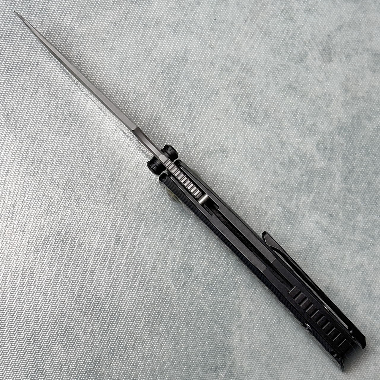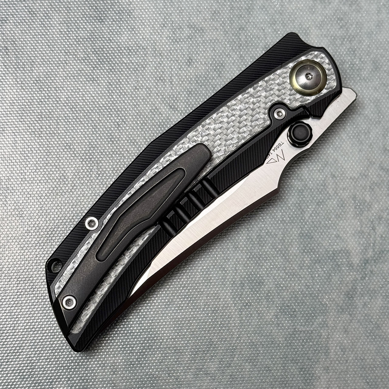 The Twosun TS554 is an amazing design. The handle is titanium with twill carbon fiber. Satin 14C28N blade. Comes with box.