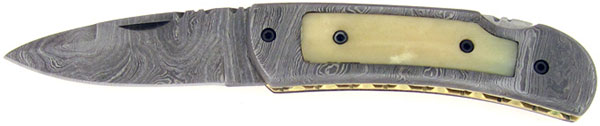 Awesome damascus handle scales with smooth white bone inlays that would be great for scrimshaw work. Matching damascus swedged spear point blade. Entirely file worked brass liners and spine which add a whole new dimension to this already awesome custom knife. Four hex head screws hold this knife together. Unknown custom lock back pocket knife that looks just excellent. Comes mint in black zip up pouch.