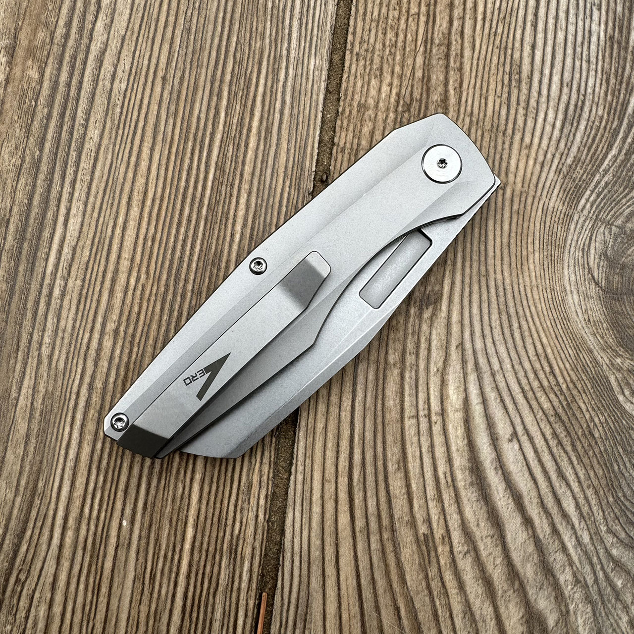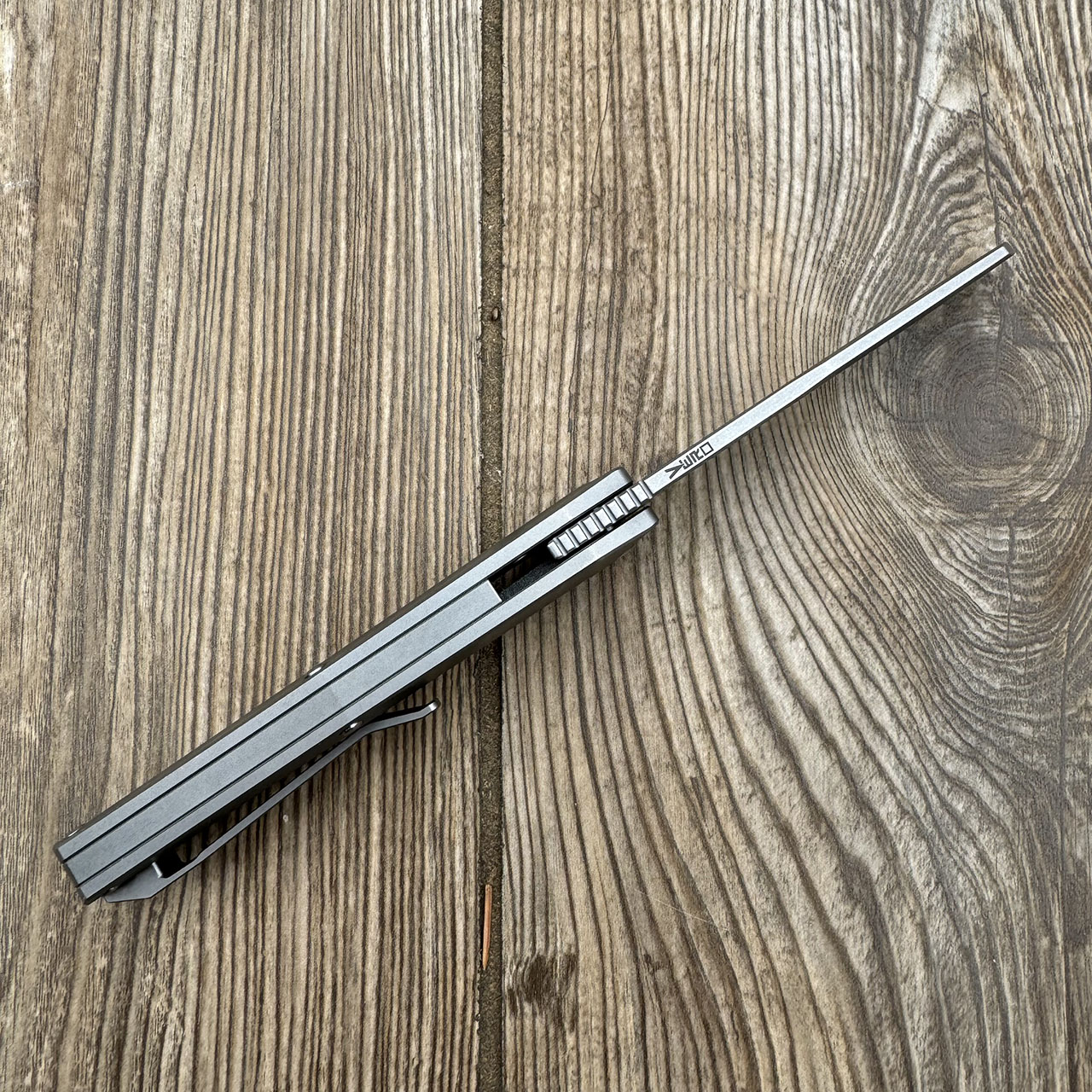 The Axon Liner Lock features full titanium construction. Milled liners, clip, backspacer, and all hardware are titanium! Blade is Bohler M390, and can be opened by the fuller or with the front flipper. This model features a stonewashed blade and stonewashed titanium scales. New in box.