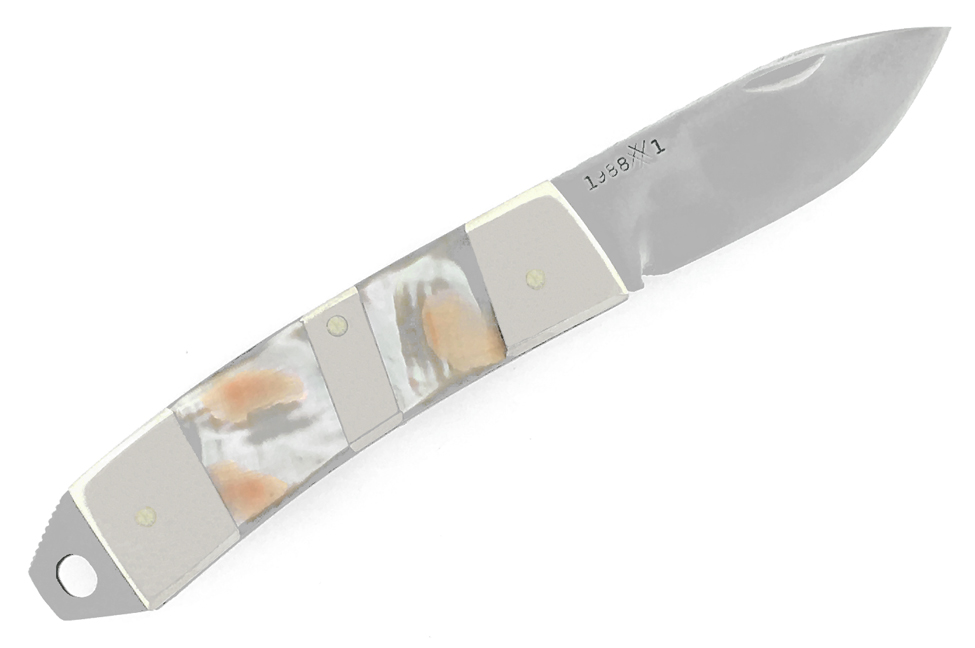 Beautiful genuine orange mother of pearl handle scales with nickel silver center strip. Satin finished razor sharp high carbon steel drop point blade with nice deep nail nicks on both sides. Tang stamped OVERHOLSER - 1988 1. Nickel silver bolsters and liners. File worked spine. Protruding lanyard hole with jimping that also acts as the blade release (tail lock). The blade has excellent snap. Looks to have been lightly used but is still in excellent condition. Made in Toledo, Oregon in 1988, this knife is unique and Overholser knives are very hard to find these days.