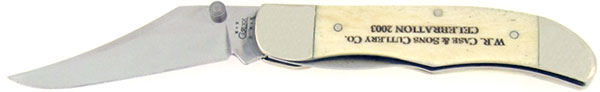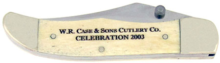 Smooth white bone handle scales, the front scale is carved and reads W.R. CASE & SONS CUTLERY CO. CELEBRATION 2003. Nickel silver bolsters, liners, and handle pins. The front bolster is etched with the serial number #0502. The dual thumb studs and liner lock make this knife easy to operate with one hand. Awesome hard to find Case XX knife. This beauty will make a great addition to anyones collection. Born 08/13/2003. Brand new in original box.