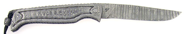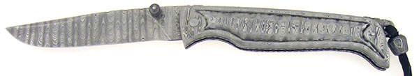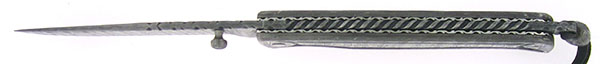 Beautiful hand forged sculpted damascus handle scales. Hand forged damascus clip point blade stamped with Wayne Valachovic's logo. Damascus thumb stud. The entire spine is elegantly rope file worked damascus. Fileworked stainless steel liners. The knife features a tail lock system which means by pushing down on the protruding lanyard hole the blade is released from its lock position. Lanyard hole with leather lanyard and damascus bead. This is a high quality and beautifully designed pocket knife by custom knife maker Wayne Valachovic. I don't get the pleasure of having Wayne's knives too often so get this one while its here. This knife was completely hand done by Wayne from the forging of the steel to the fit and finish. Wow! Comes mint in black zip up pouch.