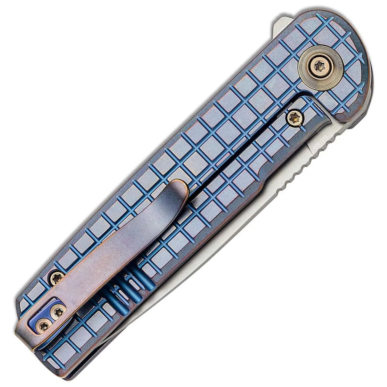 The charith is a truely elegant piece, beautiful blue anodized frag pattern milled titanium handles and a bead blast CPM-20CV stainless steel blade. This model is limited to 300 pieces ever made. Brand new in box.