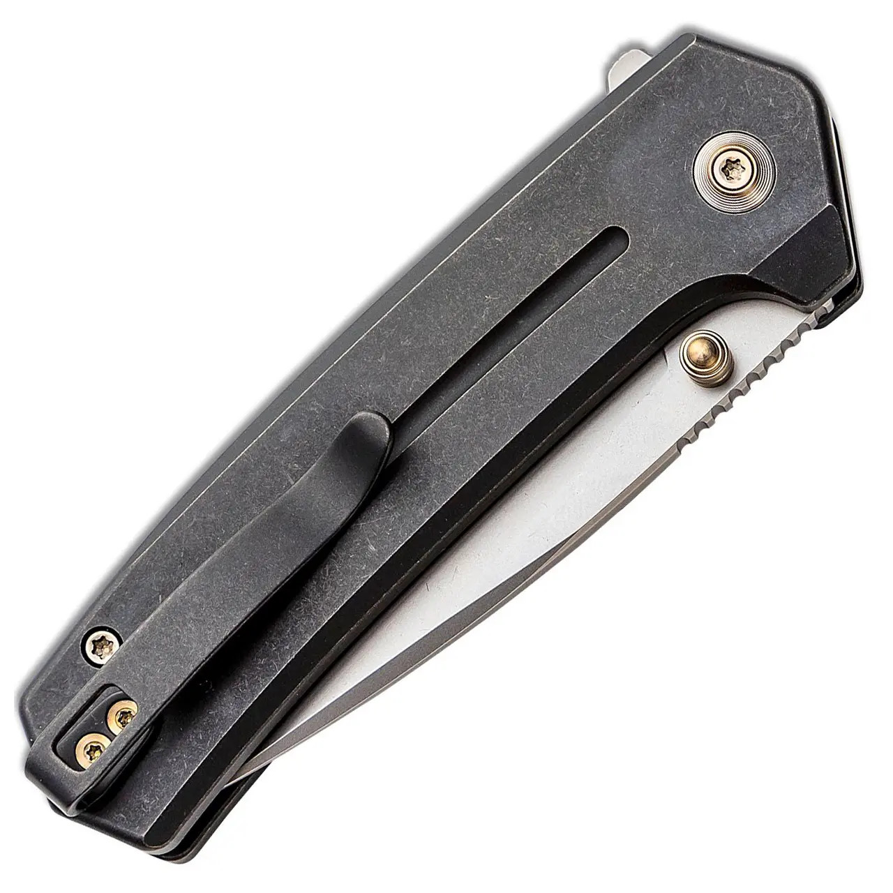 A sub three inch button lock with premium materials and features, The Culex is EDC perfection with a flipper tab and thumb stud opening methods, This model has black titanium handles, and a bead blast CPM-20CV drop point blade, and a reversible deep carry pocket clip. Brand new in box.