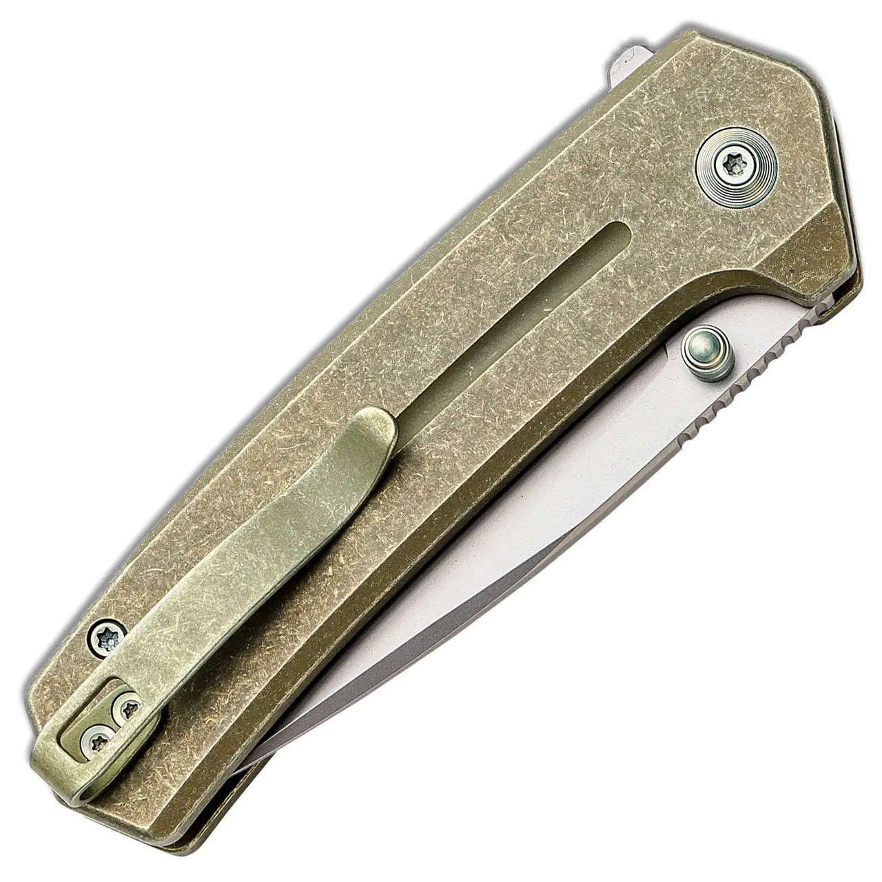 A sub three inch button lock with premium materials and features, The Culex is EDC perfection with a flipper tab and thumb stud opening methods, This model has green titanium handles, and a bead blast CPM-20CV drop point blade, and a reversible deep carry pocket clip. Brand new in box.