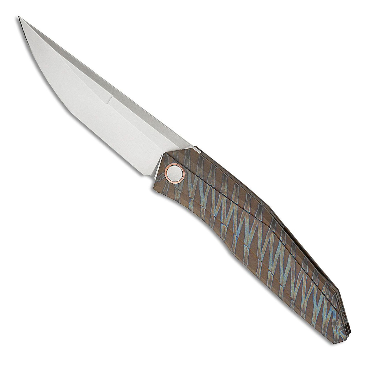 Beautiful tiger stripe flamed titanium handles with a bead blast CPM-20CV blade. These are limited to only 200 pieces and have amazing drop shut action. Unique front flipper deployment, right hand tip up carry only. Brand new in box.