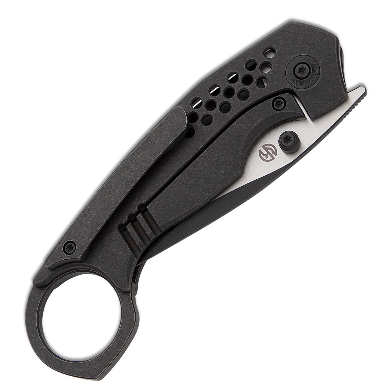 The envisage is designed by Tuff Knives and is a karambit syle knife. Front flipper and thumbstud deployment options, and a pinky ring. Brand new in box.