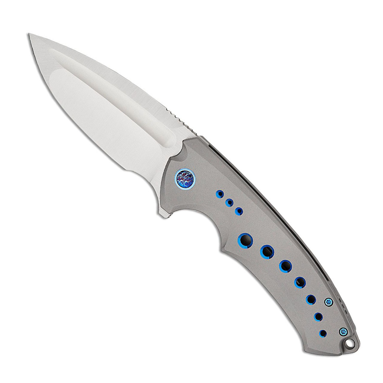 Gray titanium handles with a hand polished satin CPM-20CV blade, speed holes with blue accents, and lightning anodized pivot. These are limited to only 155 pieces and have amazing ergonomics giving you a nice secure grip. Flipper deployment, right hand tip up carry only. Brand new in box.